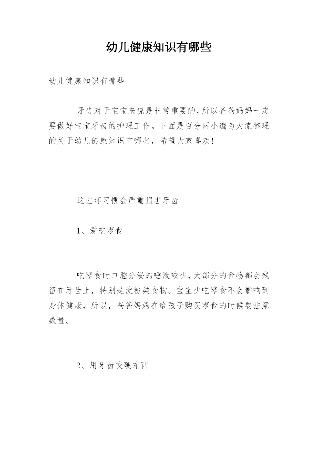 幼儿健康知识有哪些幼儿健康知识有哪些牙齿对于宝宝来说是非常重要的,所以爸爸妈妈一定要做好宝宝牙齿的护理工作。下面是百分网小编为大家整理的关于幼儿健康知识有哪些,希望大家喜欢!这些坏习惯会严重损害牙齿1、爱吃零食吃零食时口腔分泌的唾液较少,大部分的食物都会残留在牙齿上,特别是淀粉类食物。宝宝少吃零食不会影响到身体健康,所以,爸爸妈妈在给孩子购买零食的时候要注意数量。2、用牙齿咬硬东西宝宝经常模仿大人用牙齿咬饮料瓶盖,有时候虽然能够成功地把瓶盖咬开,但在这个过程中牙齿可能会出现一些隐裂,这个“小问