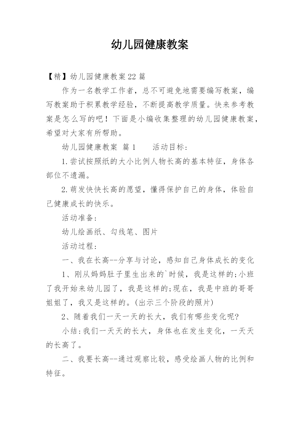 幼儿园健康教案【精】幼儿园健康教案22篇作为一名教学工作者,总不可避免地需要编写教案,编写教案助于积累教学经验,不断提高教学质量。快来参考教案是怎么写的吧!下面是小编收集整理的幼儿园健康教案,希望对大家有所帮助。幼儿园健康教案篇1活动目标:1.尝试按照纸的大小比例人物长高的基本特征,身体各部位不遗漏。2.萌发快快长高的愿望,懂得保护自己的身体,体验自己健康成长的快乐。活动准备:幼儿绘画纸、勾线笔、图片活动过程:一、我在长高--分享与讨论,感知自己身体成长的变化1、刚从妈妈肚子里生出来的`时候,我是这样的;