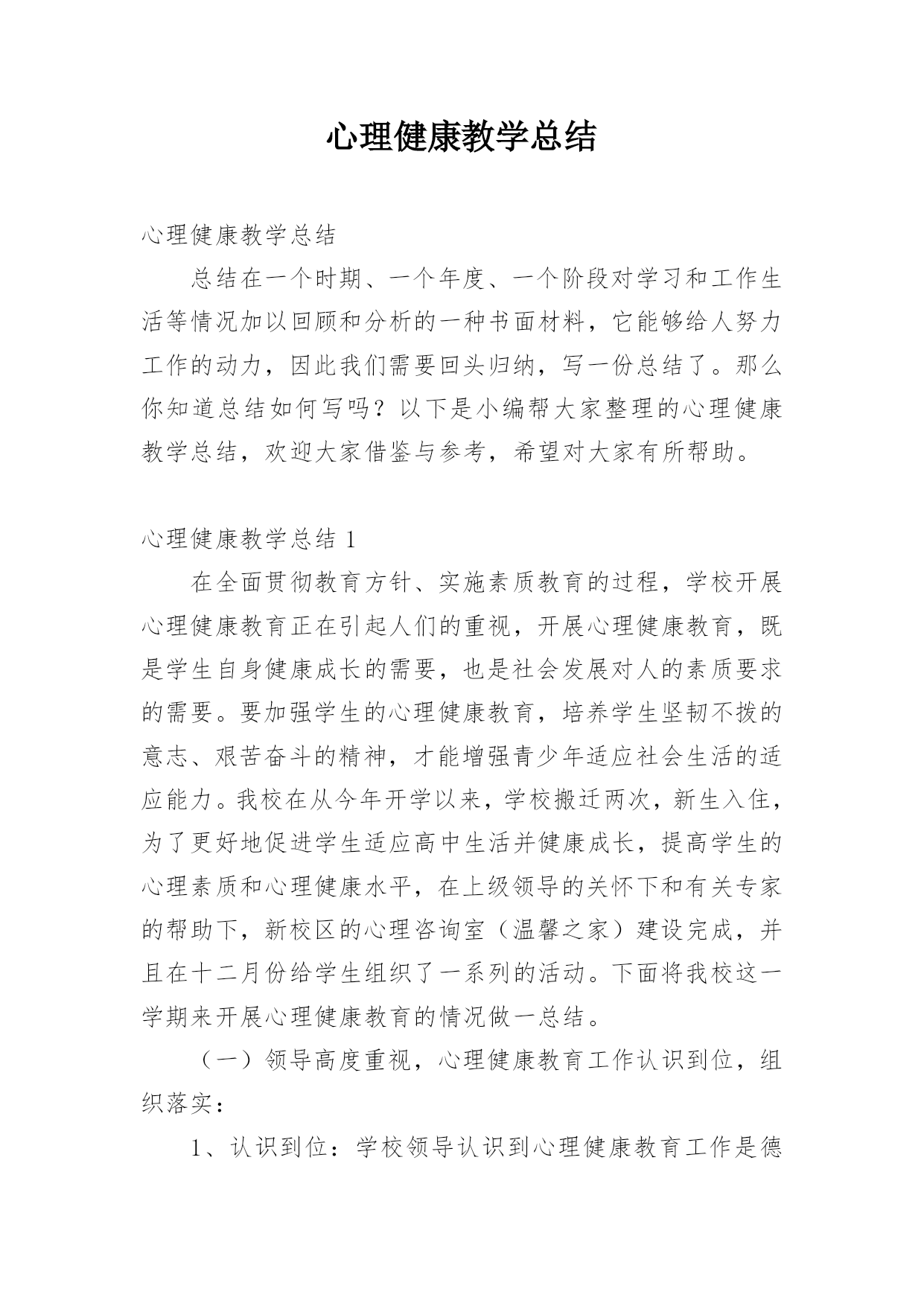 心理健康教学总结心理健康教学总结总结在一个时期、一个年度、一个阶段对学习和工作生活等情况加以回顾和分析的一种书面材料,它能够给人努力工作的动力,因此我们需要回头归纳,写一份总结了。那么你知道总结如何写吗?以下是小编帮大家整理的心理健康教学总结,欢迎大家借鉴与参考,希望对大家有所帮助。心理健康教学总结1在全面贯彻教育方针、实施素质教育的过程,学校开展心理健康教育正在引起人们的重视,开展心理健康教育,既是学生自身健康成长的需要,也是社会发展对人的素质要求的需要。要加强学生的心理健康教育,培养学生坚韧不拨的意志