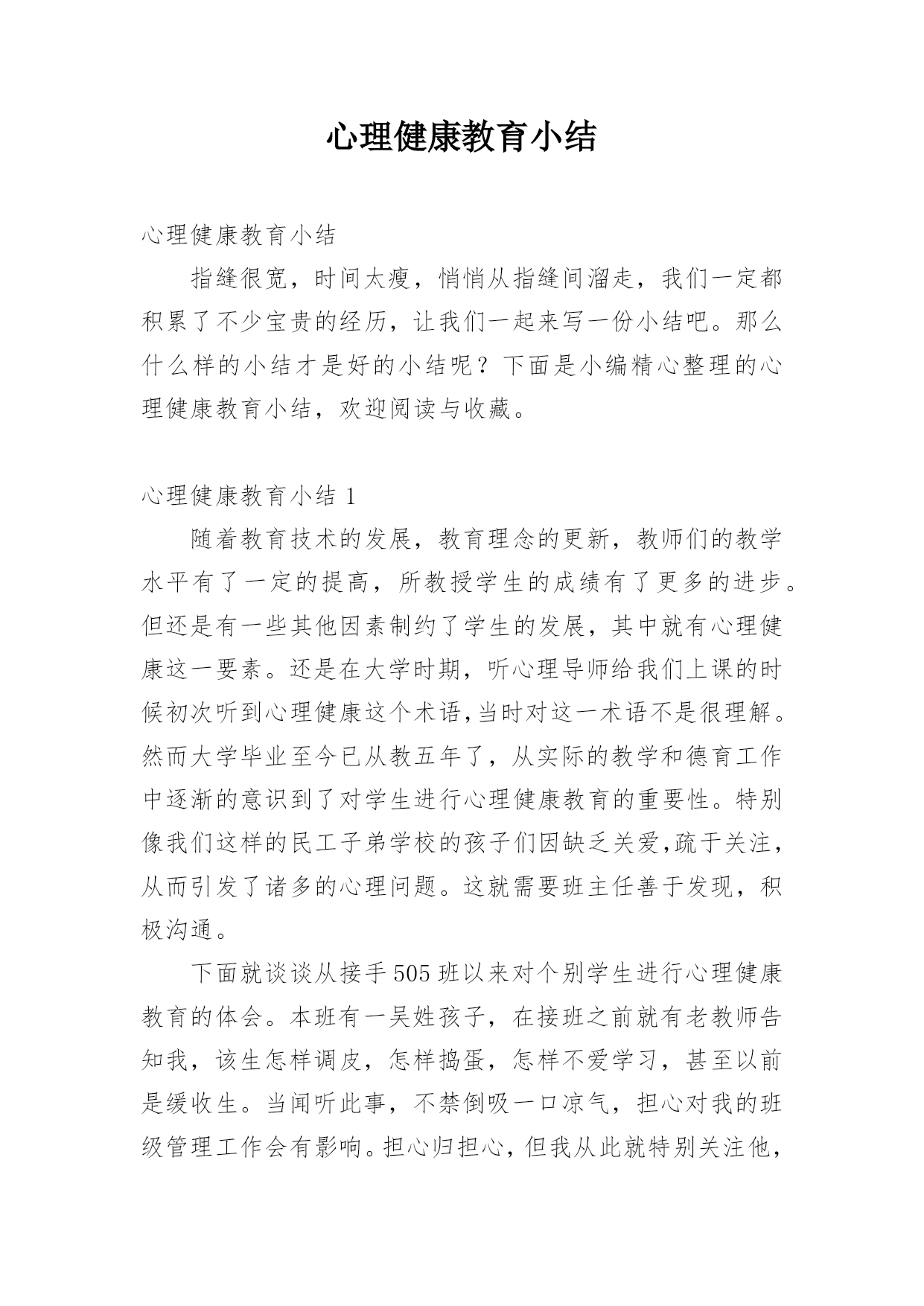 心理健康教育小结心理健康教育小结指缝很宽,时间太瘦,悄悄从指缝间溜走,我们一定都积累了不少宝贵的经历,让我们一起来写一份小结吧。那么什么样的小结才是好的小结呢?下面是小编精心整理的心理健康教育小结,欢迎阅读与收藏。心理健康教育小结1随着教育技术的发展,教育理念的更新,教师们的教学水平有了一定的提高,所教授学生的成绩有了更多的进步。但还是有一些其他因素制约了学生的发展,其中就有心理健康这一要素。还是在大学时期,听心理导师给我们上课的时候初次听到心理健康这个术语,当时对这一术语不是很理解。然而大学毕业至今已从