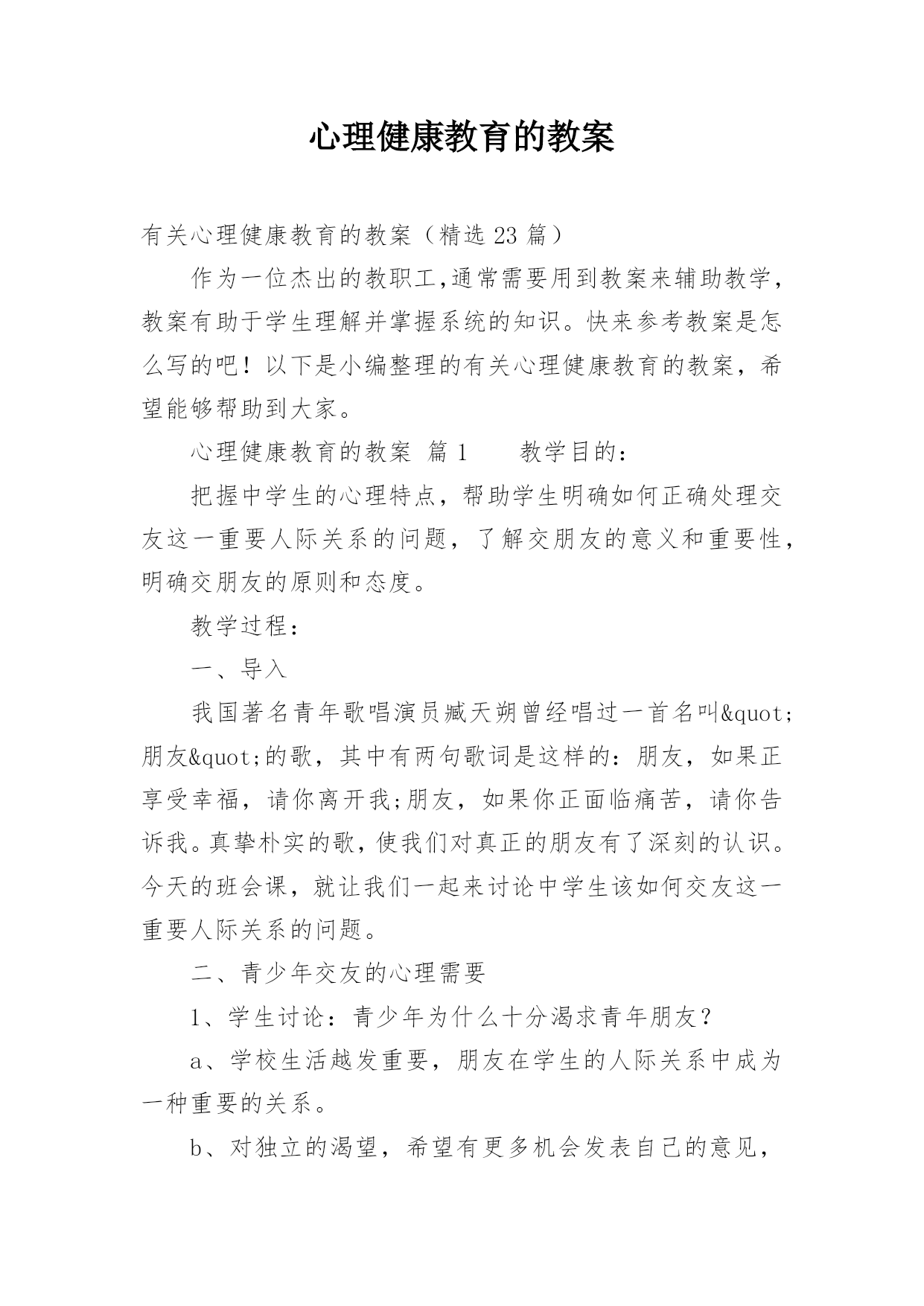 心理健康教育的教案有关心理健康教育的教案(精选23篇)作为一位杰出的教职工,通常需要用到教案来辅助教学,教案有助于学生理解并掌握系统的知识。快来参考教案是怎么写的吧!以下是小编整理的有关心理健康教育的教案,希望能够帮助到大家。心理健康教育的教案篇1教学目的:把握中学生的心理特点,帮助学生明确如何正确处理交友这一重要人际关系的问题,了解交朋友的意义和重要性,明确交朋友的原则和态度。教学过程:一、导入我国著名青年歌唱演员臧天朔曾经唱过一首名叫"朋友"的歌,其中有两句歌词是这样的:朋友,如果