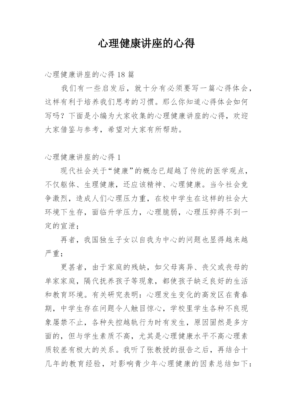 心理健康讲座的心得心理健康讲座的心得18篇我们有一些启发后,就十分有必须要写一篇心得体会,这样有利于培养我们思考的习惯。那么你知道心得体会如何写吗?下面是小编为大家收集的心理健康讲座的心得,欢迎大家借鉴与参考,希望对大家有所帮助。心理健康讲座的心得1现代社会关于“健康”的概念已超越了传统的医学观点,不仅躯体、生理健康,还应该精神、心理健康。当今社会竞争激烈,造成人们心理压力重,在校中学生在这样的社会大环境下生存,面临升学压力,心理脆弱,心理压抑得不到一定的宣泄;再者,我国独生子女以自我为中心的问题也显得越