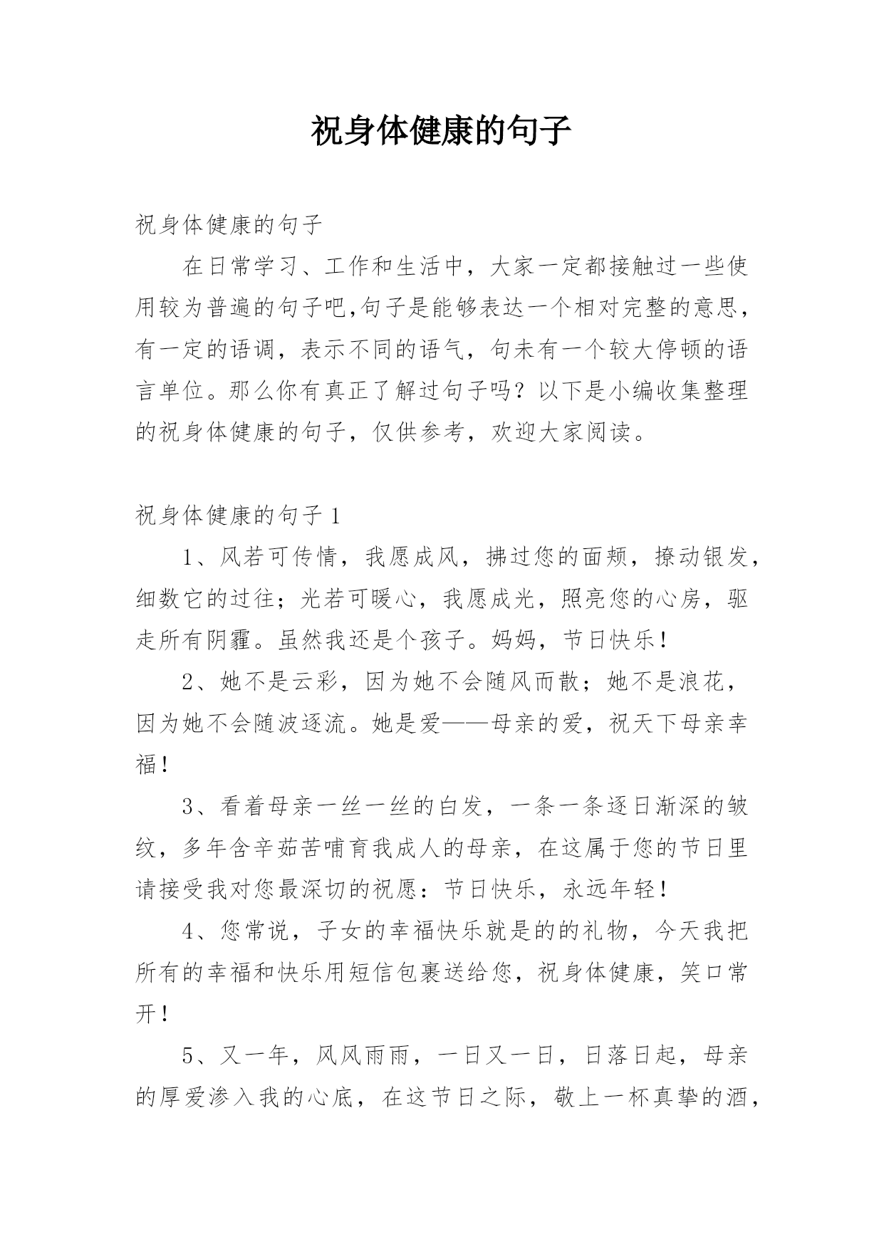 祝身体健康的句子祝身体健康的句子在日常学习、工作和生活中,大家一定都接触过一些使用较为普遍的句子吧,句子是能够表达一个相对完整的意思,有一定的语调,表示不同的语气,句未有一个较大停顿的语言单位。那么你有真正了解过句子吗?以下是小编收集整理的祝身体健康的句子,仅供参考,欢迎大家阅读。祝身体健康的句子11、风若可传情,我愿成风,拂过您的面颊,撩动银发,细数它的过往;光若可暖心,我愿成光,照亮您的心房,驱走所有阴霾。虽然我还是个孩子。妈妈,节日快乐!2、她不是云彩,因为她不会随风而散;她不是浪花,因为她不会随波