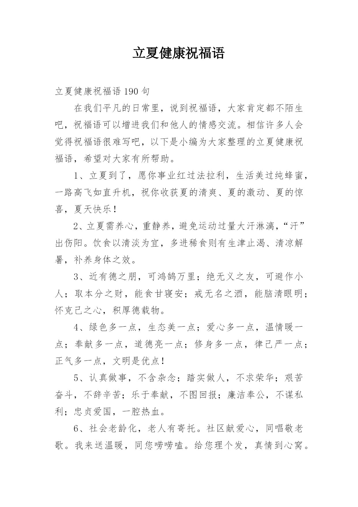 立夏健康祝福语立夏健康祝福语190句在我们平凡的日常里,说到祝福语,大家肯定都不陌生吧,祝福语可以增进我们和他人的情感交流。相信许多人会觉得祝福语很难写吧,以下是小编为大家整理的立夏健康祝福语,希望对大家有所帮助。1、立夏到了,愿你事业红过法拉利,生活美过纯蜂蜜,一路高飞如直升机,祝你收获夏的清爽、夏的激动、夏的惊喜,夏天快乐!2、立夏需养心,重静养,避免运动过量大汗淋漓,“汗”出伤阳。饮食以清淡为宜,多进稀食则有生津止渴、清凉解暑,补养身体之效。3、近有德之朋,可鸿鹄万里;绝无义之友,可避作小人;取本分