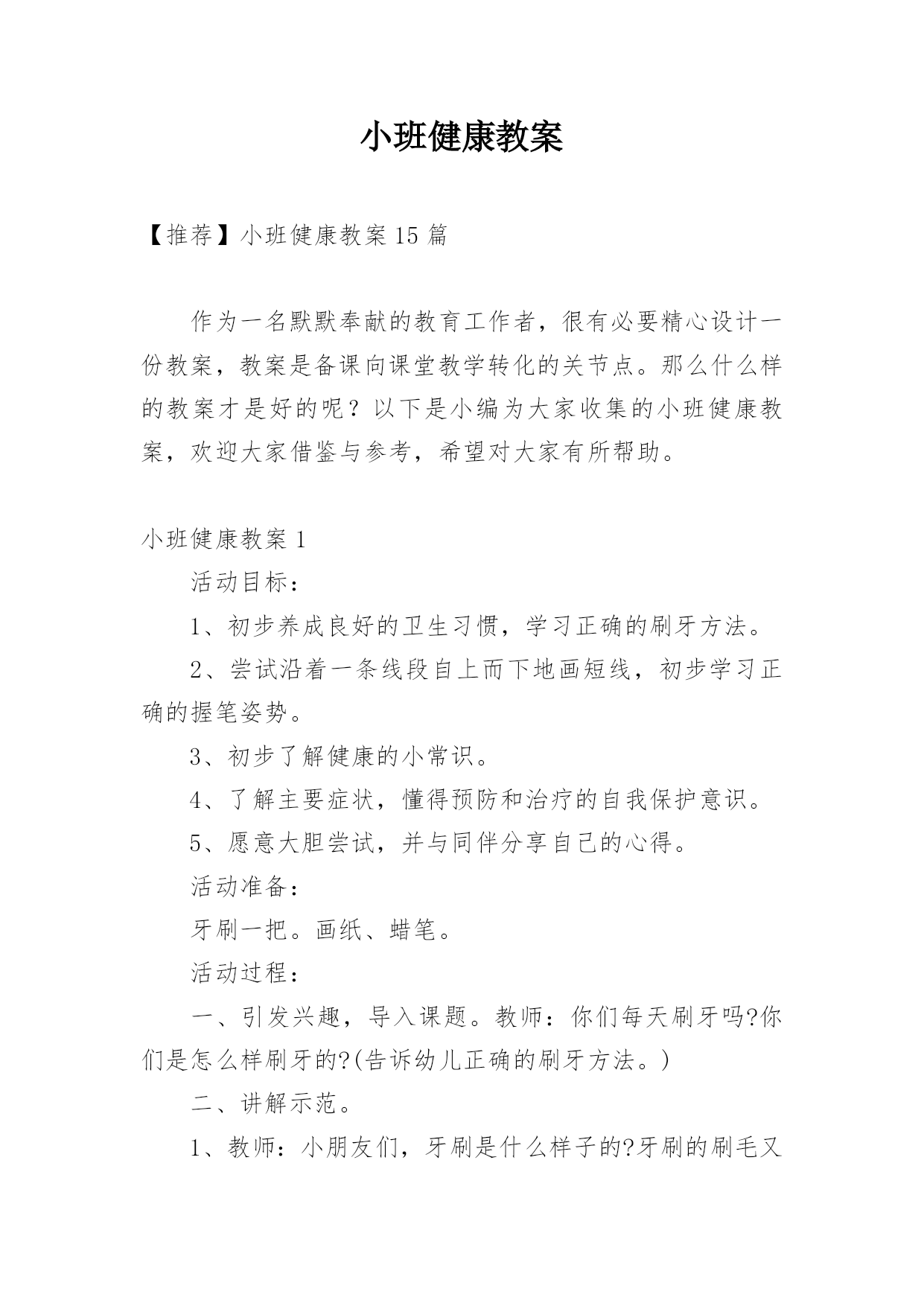 小班健康教案【推荐】小班健康教案15篇作为一名默默奉献的教育工作者,很有必要精心设计一份教案,教案是备课向课堂教学转化的关节点。那么什么样的教案才是好的呢?以下是小编为大家收集的小班健康教案,欢迎大家借鉴与参考,希望对大家有所帮助。小班健康教案1活动目标:1、初步养成良好的卫生习惯,学习正确的刷牙方法。2、尝试沿着一条线段自上而下地画短线,初步学习正确的握笔姿势。3、初步了解健康的小常识。4、了解主要症状,懂得预防和治疗的自我保护意识。5、愿意大胆尝试,并与同伴分享自己的心得。活动准备:牙刷一把。画纸、蜡