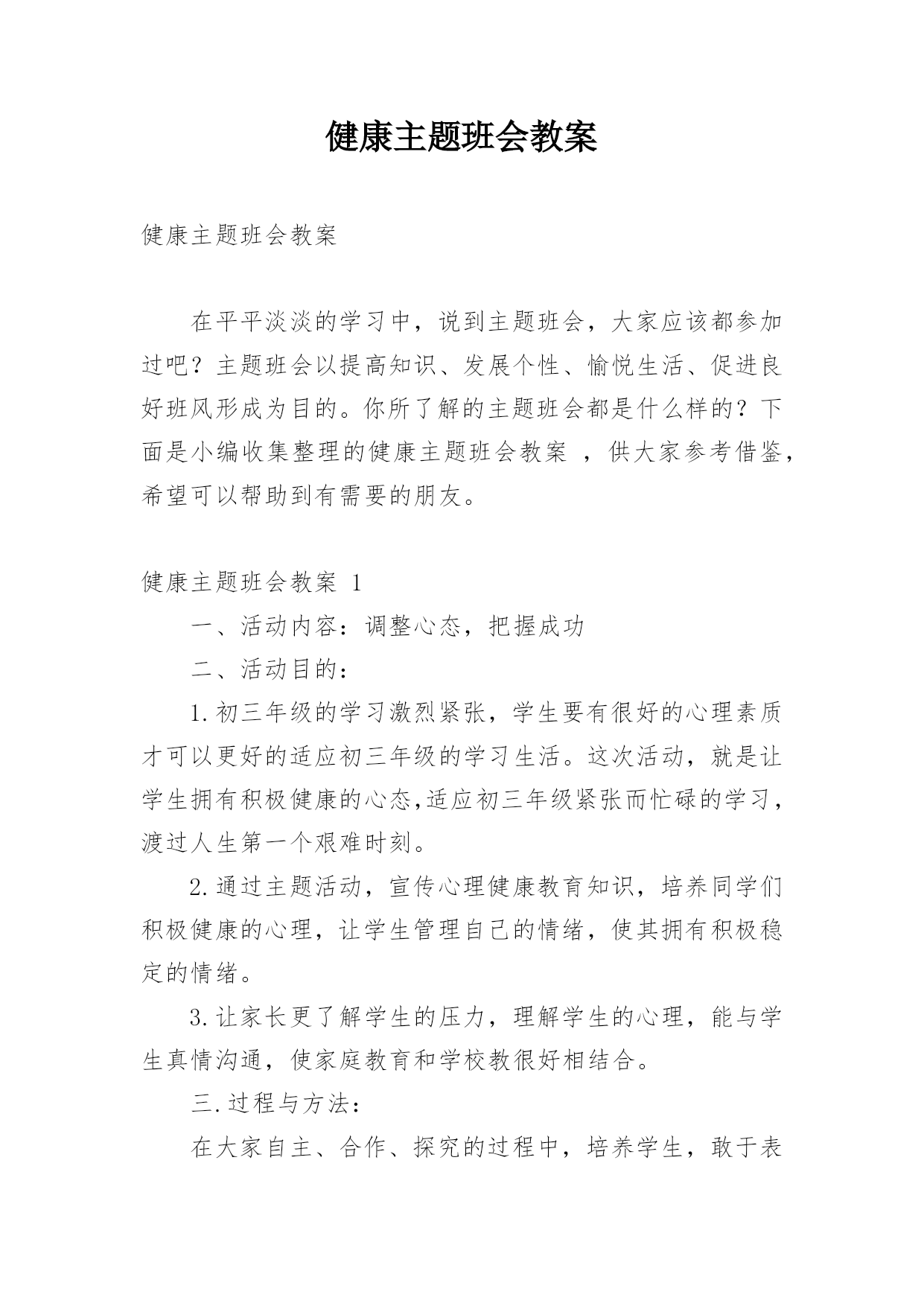 健康主题班会教案健康主题班会教案在平平淡淡的学习中,说到主题班会,大家应该都参加过吧?主题班会以提高知识、发展个性、愉悦生活、促进良好班风形成为目的。你所了解的主题班会都是什么样的?下面是小编收集整理的健康主题班会教案,供大家参考借鉴,希望可以帮助到有需要的朋友。健康主题班会教案1一、活动内容:调整心态,把握成功二、活动目的:1.初三年级的学习激烈紧张,学生要有很好的心理素质才可以更好的适应初三年级的学习生活。这次活动,就是让学生拥有积极健康的心态,适应初三年级紧张而忙碌的学习,渡过人生第一个艰难时刻。2