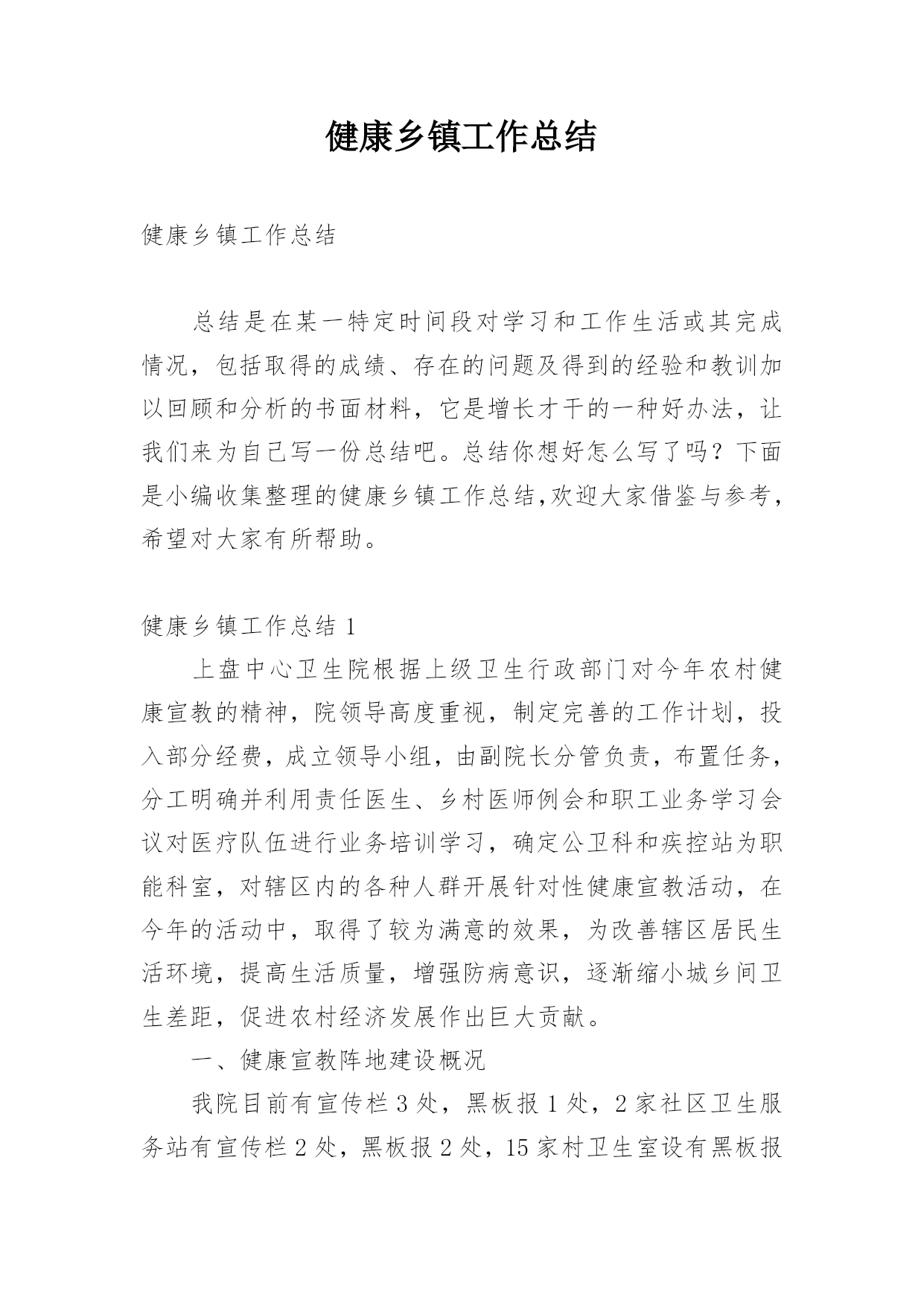 健康乡镇工作总结健康乡镇工作总结总结是在某一特定时间段对学习和工作生活或其完成情况,包括取得的成绩、存在的问题及得到的经验和教训加以回顾和分析的书面材料,它是增长才干的一种好办法,让我们来为自己写一份总结吧。总结你想好怎么写了吗?下面是小编收集整理的健康乡镇工作总结,欢迎大家借鉴与参考,希望对大家有所帮助。健康乡镇工作总结1上盘中心卫生院根据上级卫生行政部门对今年农村健康宣教的精神,院领导高度重视,制定完善的工作计划,投入部分经费,成立领导小组,由副院长分管负责,布置任务,分工明确并利用责任医生、乡村医师