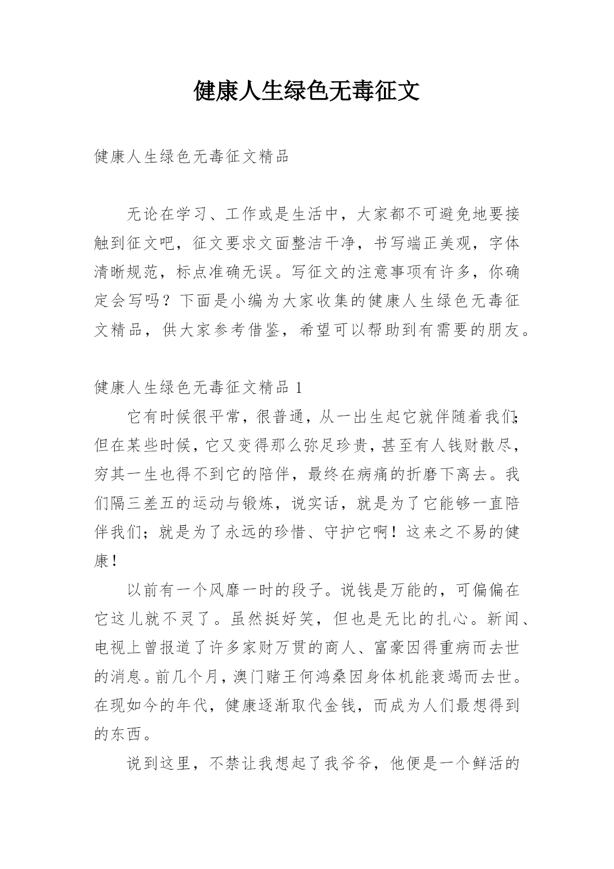 健康人生绿色无毒征文健康人生绿色无毒征文精品无论在学习、工作或是生活中,大家都不可避免地要接触到征文吧,征文要求文面整洁干净,书写端正美观,字体清晰规范,标点准确无误。写征文的注意事项有许多,你确定会写吗?下面是小编为大家收集的健康人生绿色无毒征文精品,供大家参考借鉴,希望可以帮助到有需要的朋友。健康人生绿色无毒征文精品1它有时候很平常,很普通,从一出生起它就伴随着我们;但在某些时候,它又变得那么弥足珍贵,甚至有人钱财散尽,穷其一生也得不到它的陪伴,最终在病痛的折磨下离去。我们隔三差五的运动与锻炼,说实话