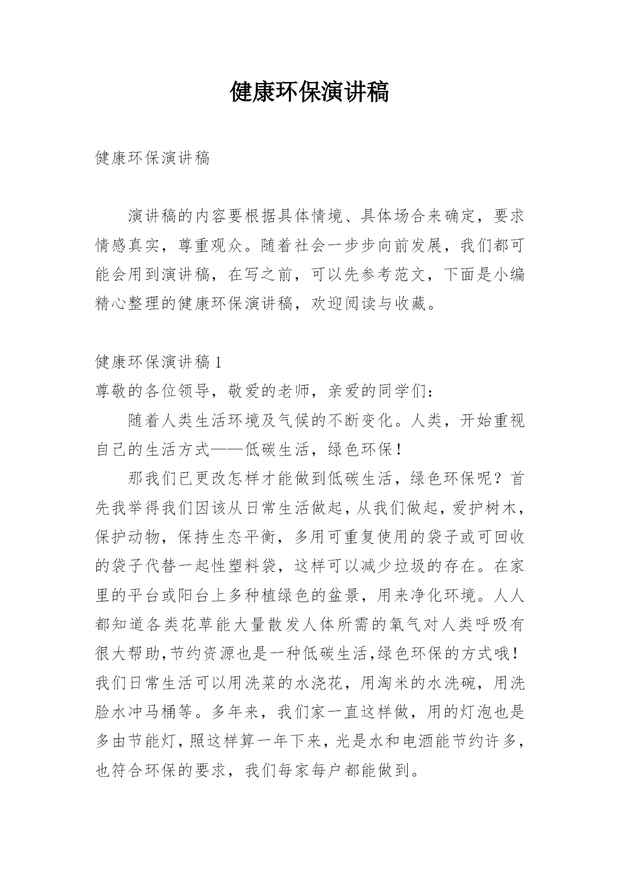 健康环保演讲稿健康环保演讲稿演讲稿的内容要根据具体情境、具体场合来确定,要求情感真实,尊重观众。随着社会一步步向前发展,我们都可能会用到演讲稿,在写之前,可以先参考范文,下面是小编精心整理的健康环保演讲稿,欢迎阅读与收藏。健康环保演讲稿1尊敬的各位领导,敬爱的老师,亲爱的同学们:随着人类生活环境及气候的不断变化。人类,开始重视自己的生活方式——低碳生活,绿色环保!那我们已更改怎样才能做到低碳生活,绿色环保呢?首先我举得我们因该从日常生活做起,从我们做起,爱护树木,保护动物,保持生态平衡,多用可重复使用的袋