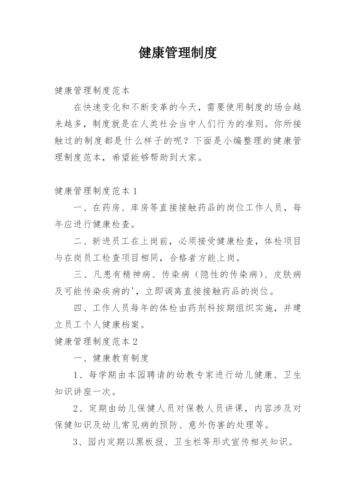 健康管理制度健康管理制度范本在快速变化和不断变革的今天,需要使用制度的场合越来越多,制度就是在人类社会当中人们行为的准则。你所接触过的制度都是什么样子的呢?下面是小编整理的健康管理制度范本,希望能够帮助到大家。健康管理制度范本1一、在药房、库房等直接接触药品的岗位工作人员,每年应进行健康检查。二、新进员工在上岗前,必须接受健康检查,体检项目与在岗员工检查项目相同,合格者方能上岗。三、凡患有精神病、传染病(隐性的传染病)、皮肤病及可能传染疾病的',立即调离直接接触药品的岗位。四、工作人员每年的体检由药剂科按