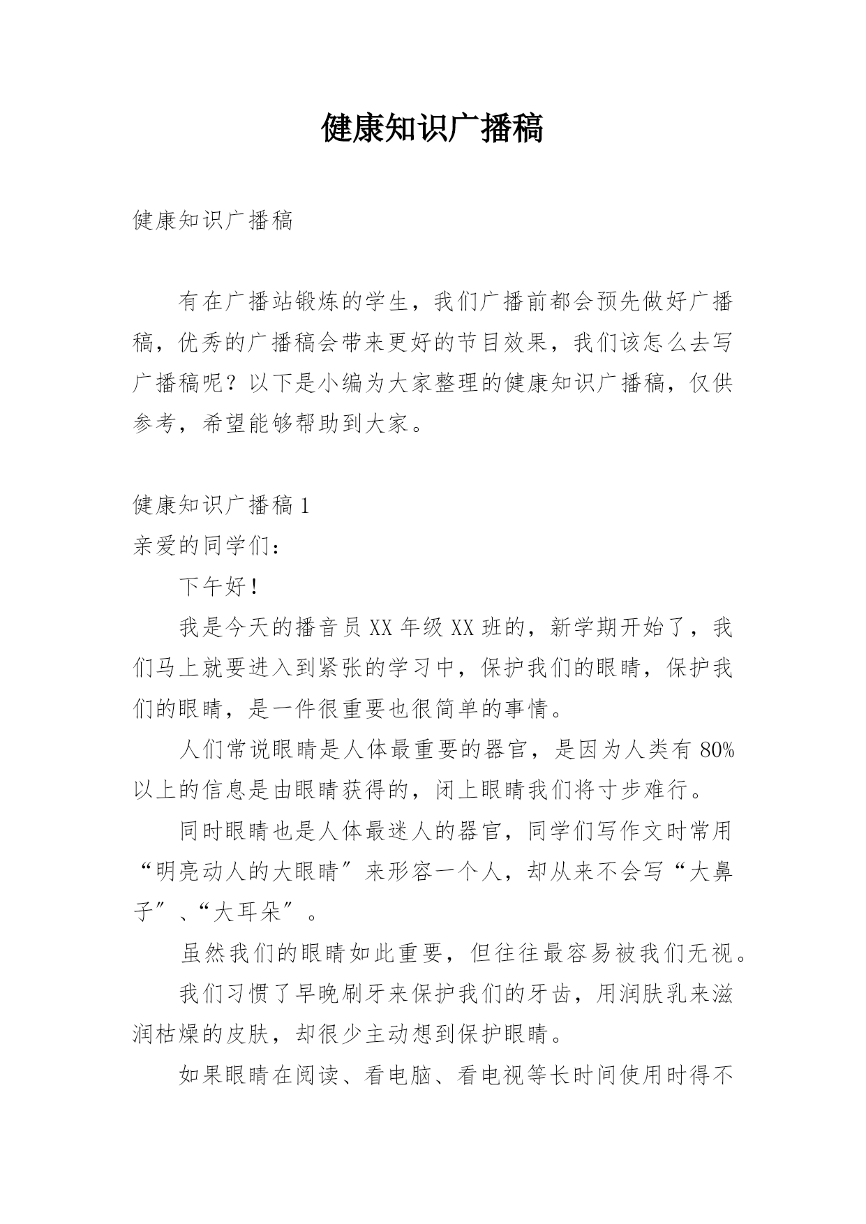 健康知识广播稿健康知识广播稿有在广播站锻炼的学生,我们广播前都会预先做好广播稿,优秀的广播稿会带来更好的节目效果,我们该怎么去写广播稿呢?以下是小编为大家整理的健康知识广播稿,仅供参考,希望能够帮助到大家。健康知识广播稿1亲爱的同学们:下午好!我是今天的播音员XX年级XX班的,新学期开始了,我们马上就要进入到紧张的学习中,保护我们的眼睛,保护我们的眼睛,是一件很重要也很简单的事情。人们常说眼睛是人体最重要的器官,是因为人类有80%以上的信息是由眼睛获得的,闭上眼睛我们将寸步难行。同时眼睛也是人体最迷人的器