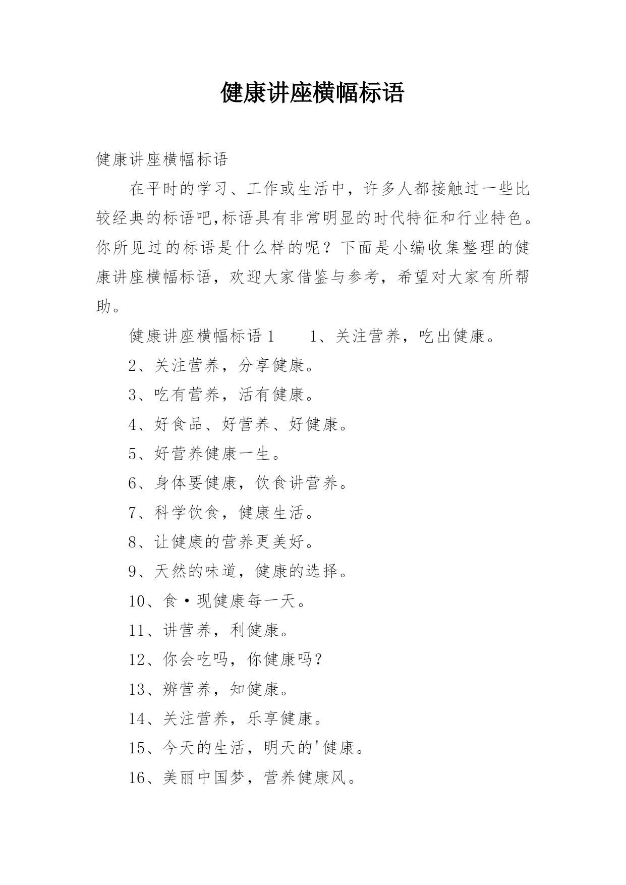 健康讲座横幅标语健康讲座横幅标语在平时的学习、工作或生活中,许多人都接触过一些比较经典的标语吧,标语具有非常明显的时代特征和行业特色。你所见过的标语是什么样的呢?下面是小编收集整理的健康讲座横幅标语,欢迎大家借鉴与参考,希望对大家有所帮助。健康讲座横幅标语11、关注营养,吃出健康。2、关注营养,分享健康。3、吃有营养,活有健康。4、好食品、好营养、好健康。5、好营养健康一生。6、身体要健康,饮食讲营养。7、科学饮食,健康生活。8、让健康的营养更美好。9、天然的味道,健康的选择。10、食·现健康每一天。11