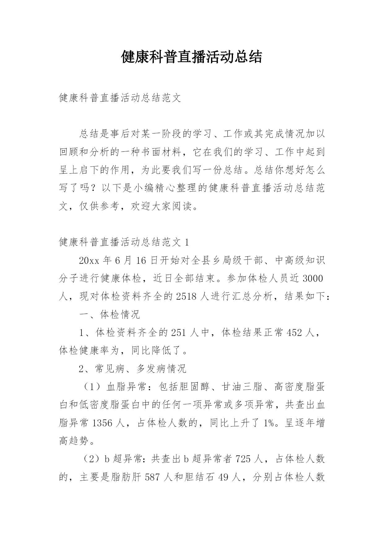 健康科普直播活动总结健康科普直播活动总结范文总结是事后对某一阶段的学习、工作或其完成情况加以回顾和分析的一种书面材料,它在我们的学习、工作中起到呈上启下的作用,为此要我们写一份总结。总结你想好怎么写了吗?以下是小编精心整理的健康科普直播活动总结范文,仅供参考,欢迎大家阅读。健康科普直播活动总结范文120xx年6月16日开始对全县乡局级干部、中高级知识分子进行健康体检,近日全部结束。参加体检人员近3000人,现对体检资料齐全的2518人进行汇总分析,结果如下:一、体检情况1、体检资料齐全的251人中,体检结