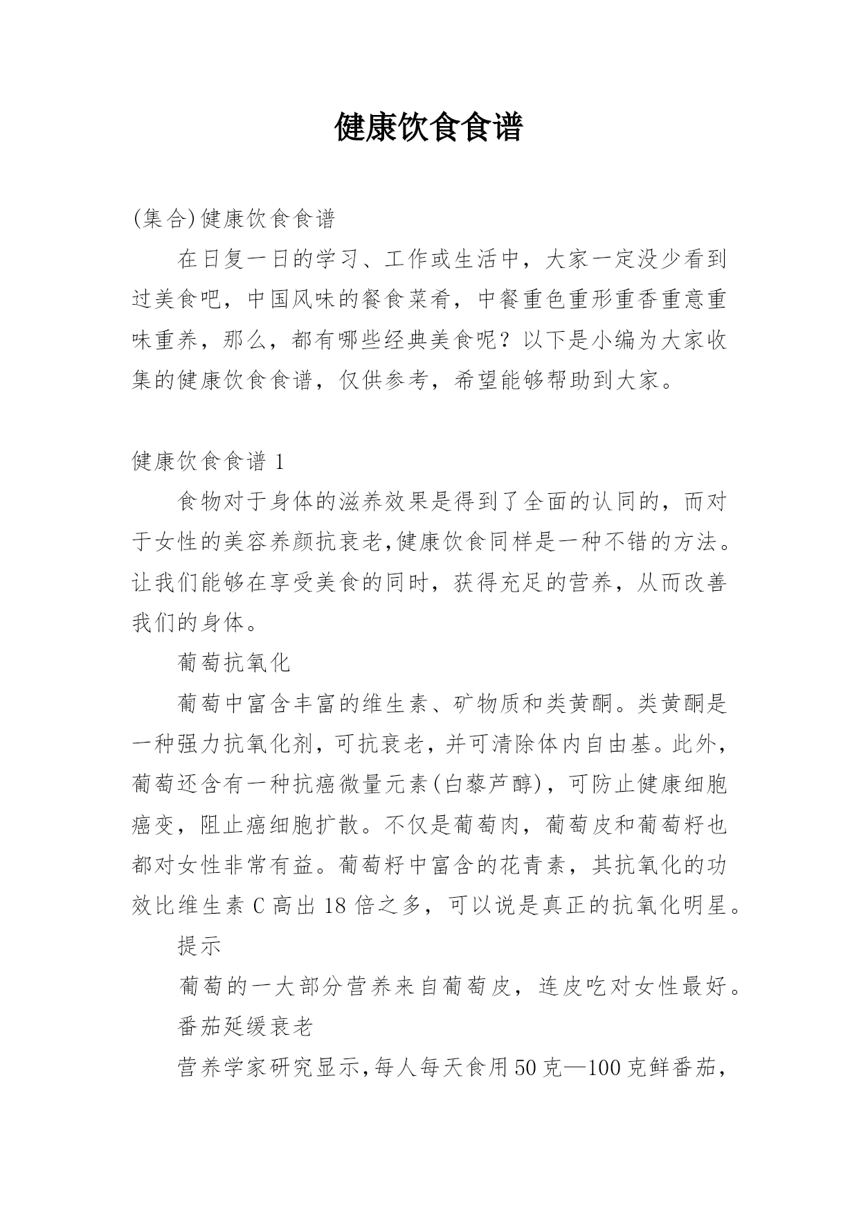 健康饮食食谱(集合)健康饮食食谱在日复一日的学习、工作或生活中,大家一定没少看到过美食吧,中国风味的餐食菜肴,中餐重色重形重香重意重味重养,那么,都有哪些经典美食呢?以下是小编为大家收集的健康饮食食谱,仅供参考,希望能够帮助到大家。健康饮食食谱1食物对于身体的滋养效果是得到了全面的认同的,而对于女性的美容养颜抗衰老,健康饮食同样是一种不错的方法。让我们能够在享受美食的同时,获得充足的营养,从而改善我们的身体。葡萄抗氧化葡萄中富含丰富的维生素、矿物质和类黄酮。类黄酮是一种强力抗氧化剂,可抗衰老,并可清除体内