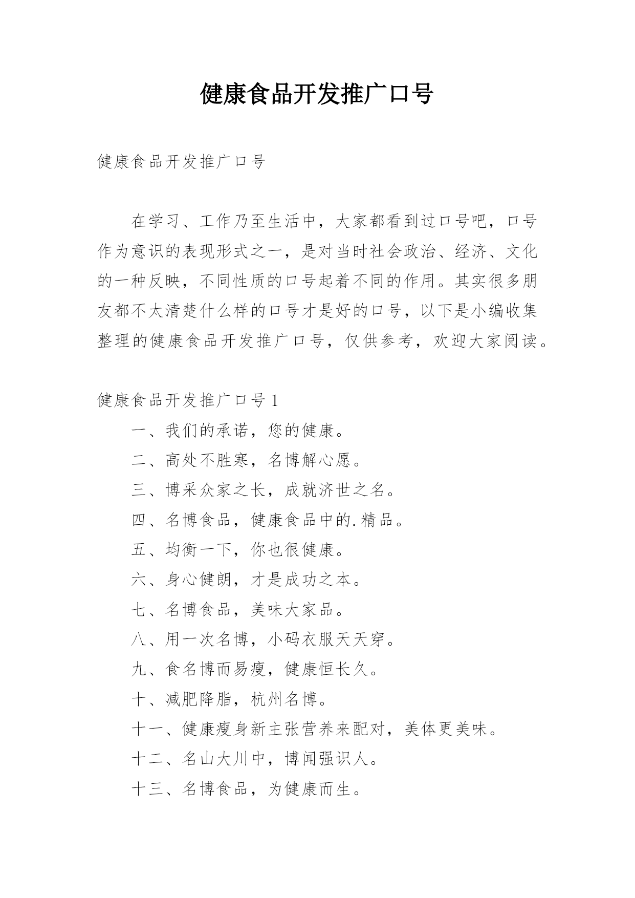健康食品开发推广口号健康食品开发推广口号在学习、工作乃至生活中,大家都看到过口号吧,口号作为意识的表现形式之一,是对当时社会政治、经济、文化的一种反映,不同性质的口号起着不同的作用。其实很多朋友都不太清楚什么样的口号才是好的口号,以下是小编收集整理的健康食品开发推广口号,仅供参考,欢迎大家阅读。健康食品开发推广口号1一、我们的承诺,您的健康。二、高处不胜寒,名博解心愿。三、博采众家之长,成就济世之名。四、名博食品,健康食品中的.精品。五、均衡一下,你也很健康。六、身心健朗,才是成功之本。七、名博食品,美味
