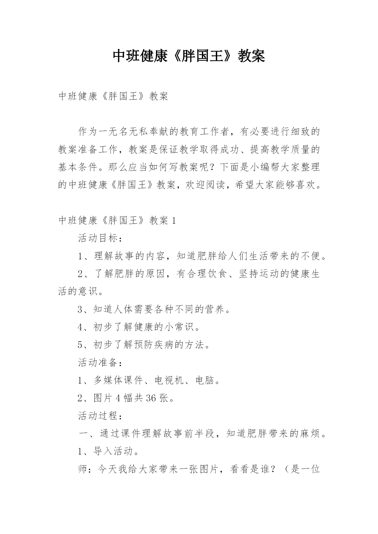 中班健康《胖国王》教案中班健康《胖国王》教案作为一无名无私奉献的教育工作者,有必要进行细致的教案准备工作,教案是保证教学取得成功、提高教学质量的基本条件。那么应当如何写教案呢?下面是小编帮大家整理的中班健康《胖国王》教案,欢迎阅读,希望大家能够喜欢。中班健康《胖国王》教案1活动目标:1、理解故事的内容,知道肥胖给人们生活带来的不便。2、了解肥胖的原因,有合理饮食、坚持运动的健康生活的意识。3、知道人体需要各种不同的营养。4、初步了解健康的小常识。5、初步了解预防疾病的方法。活动准备:1、多媒体课件、电视机