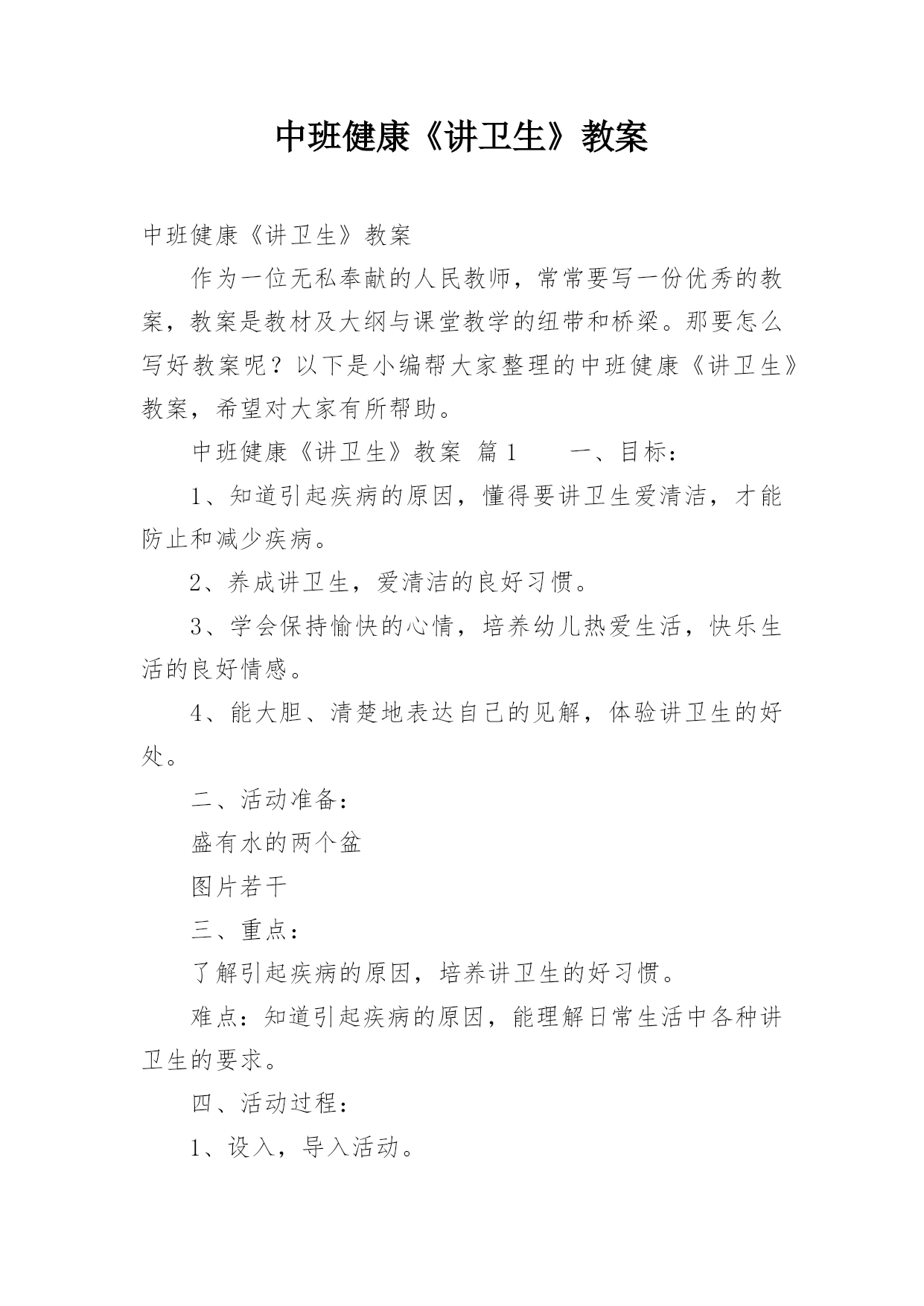 中班健康《讲卫生》教案中班健康《讲卫生》教案作为一位无私奉献的人民教师,常常要写一份优秀的教案,教案是教材及大纲与课堂教学的纽带和桥梁。那要怎么写好教案呢?以下是小编帮大家整理的中班健康《讲卫生》教案,希望对大家有所帮助。中班健康《讲卫生》教案篇1一、目标:1、知道引起疾病的原因,懂得要讲卫生爱清洁,才能防止和减少疾病。2、养成讲卫生,爱清洁的良好习惯。3、学会保持愉快的心情,培养幼儿热爱生活,快乐生活的良好情感。4、能大胆、清楚地表达自己的见解,体验讲卫生的好处。二、活动准备:盛有水的两个盆图片若干三、