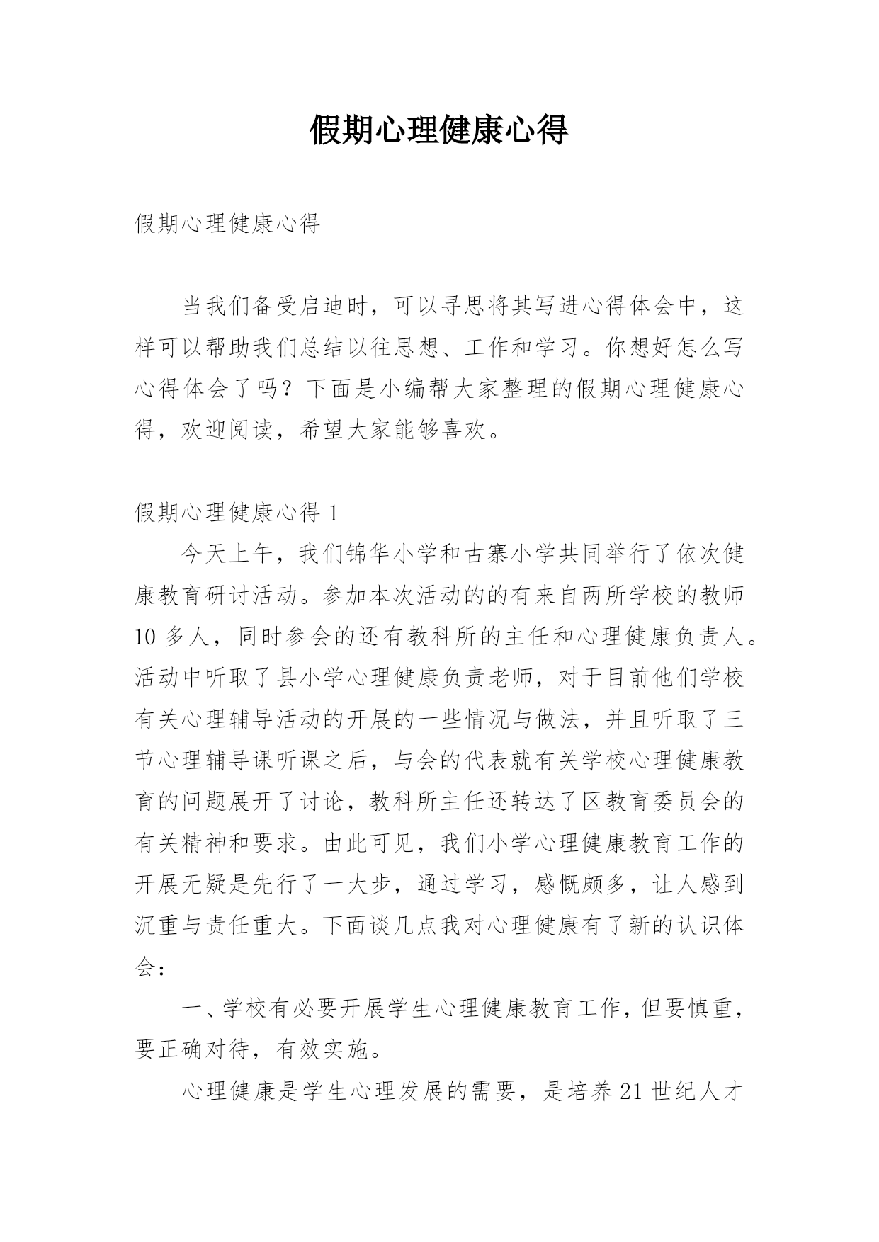 假期心理健康心得假期心理健康心得当我们备受启迪时,可以寻思将其写进心得体会中,这样可以帮助我们总结以往思想、工作和学习。你想好怎么写心得体会了吗?下面是小编帮大家整理的假期心理健康心得,欢迎阅读,希望大家能够喜欢。假期心理健康心得1今天上午,我们锦华小学和古寨小学共同举行了依次健康教育研讨活动。参加本次活动的的有来自两所学校的教师10多人,同时参会的还有教科所的主任和心理健康负责人。活动中听取了县小学心理健康负责老师,对于目前他们学校有关心理辅导活动的开展的一些情况与做法,并且听取了三节心理辅导课听课之后