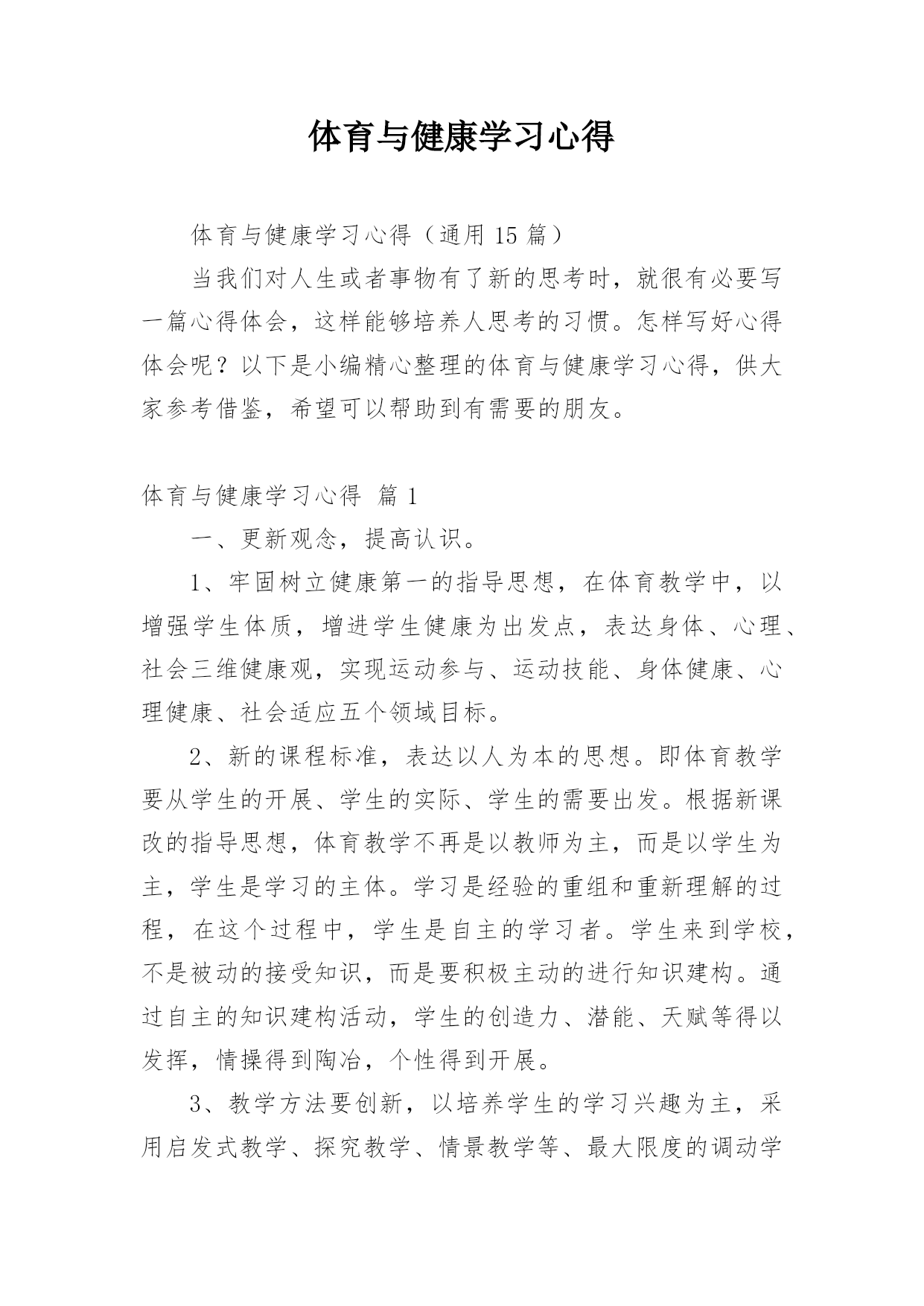 体育与健康学习心得体育与健康学习心得(通用15篇)当我们对人生或者事物有了新的思考时,就很有必要写一篇心得体会,这样能够培养人思考的习惯。怎样写好心得体会呢?以下是小编精心整理的体育与健康学习心得,供大家参考借鉴,希望可以帮助到有需要的朋友。体育与健康学习心得篇1一、更新观念,提高认识。1、牢固树立健康第一的指导思想,在体育教学中,以增强学生体质,增进学生健康为出发点,表达身体、心理、社会三维健康观,实现运动参与、运动技能、身体健康、心理健康、社会适应五个领域目标。2、新的课程标准,表达以人为本的思想。即