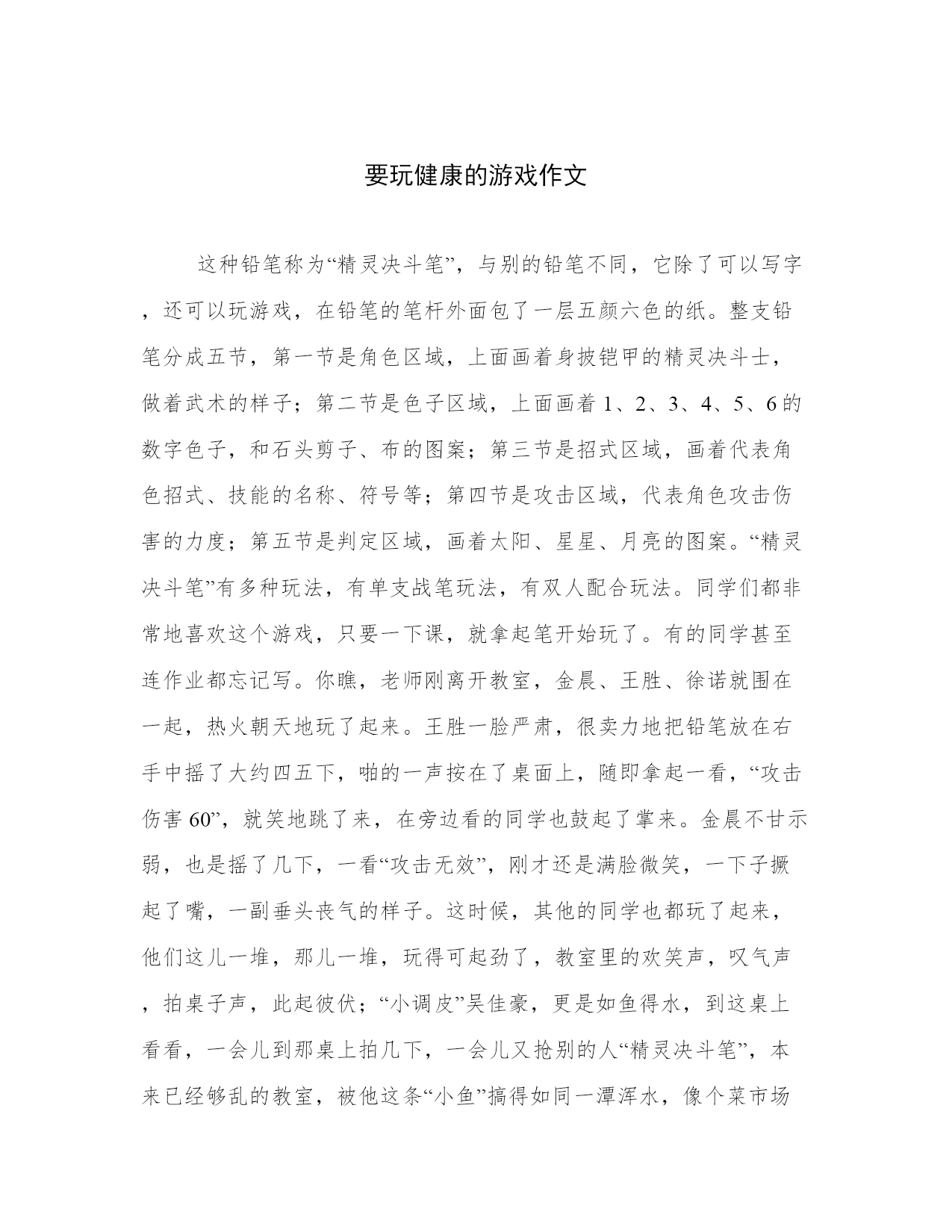 要玩健康的游戏作文这种铅笔称为“精灵决斗笔”,与别的铅笔不同,它除了可以写字,还可以玩游戏,在铅笔的笔杆外面包了一层五颜六色的纸。整支铅笔分成五节,第一节是角色区域,上面画着身披铠甲的精灵决斗士,做着武术的样子;第二节是色子区域,上面画着1、2、3、4、5、6的数字色子,和石头剪子、布的图案;第三节是招式区域,画着代表角色招式、技能的名称、符号等;第四节是攻击区域,代表角色攻击伤害的力度;第五节是判定区域,画着太阳、星星、月亮的图案。“精灵决斗笔”有多种玩法,有单支战笔玩法,有双人配合玩法。同学们都非常地