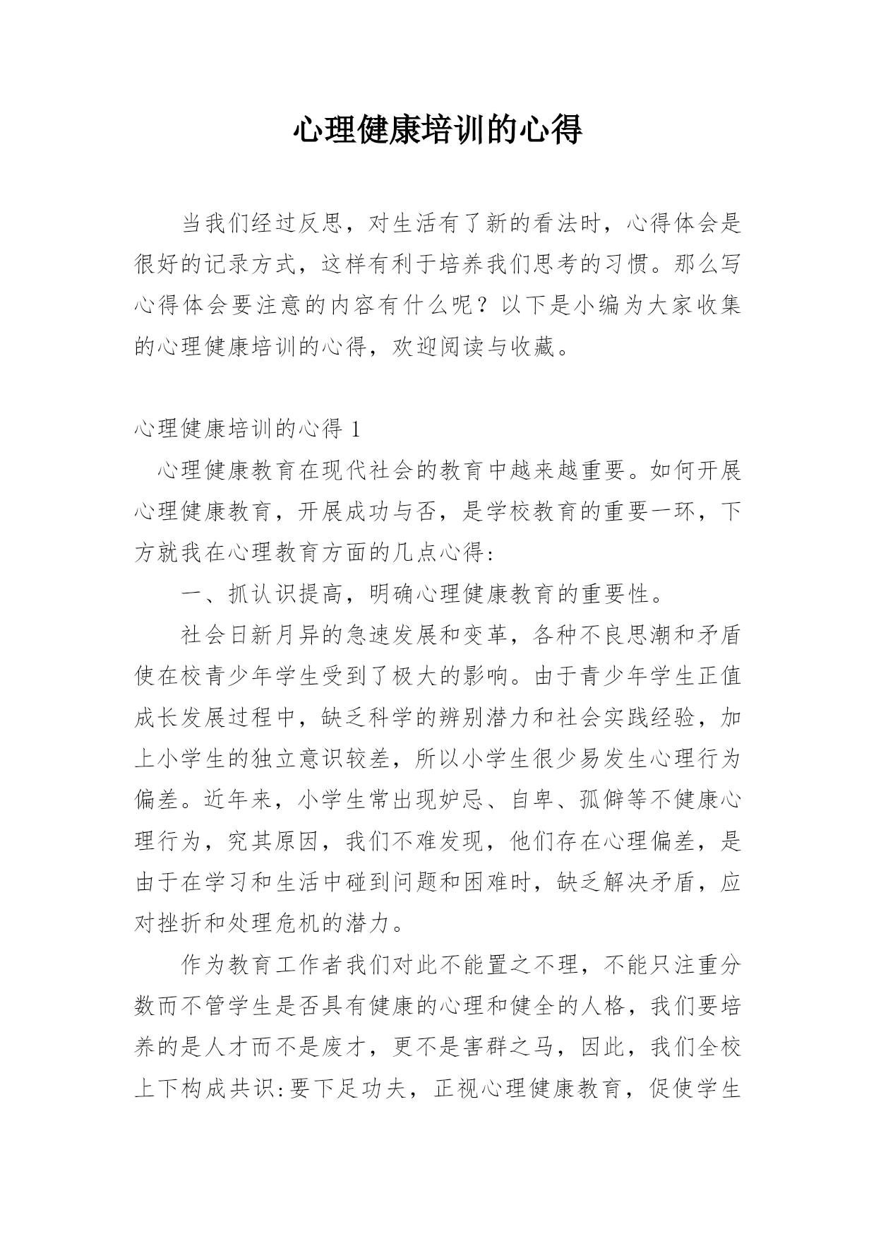 心理健康培训的心得当我们经过反思,对生活有了新的看法时,心得体会是很好的记录方式,这样有利于培养我们思考的习惯。那么写心得体会要注意的内容有什么呢?以下是小编为大家收集的心理健康培训的心得,欢迎阅读与收藏。心理健康培训的心得1心理健康教育在现代社会的教育中越来越重要。如何开展心理健康教育,开展成功与否,是学校教育的重要一环,下方就我在心理教育方面的几点心得:一、抓认识提高,明确心理健康教育的重要性。社会日新月异的急速发展和变革,各种不良思潮和矛盾使在校青少年学生受到了极大的影响。由于青少年学生正值成长发展