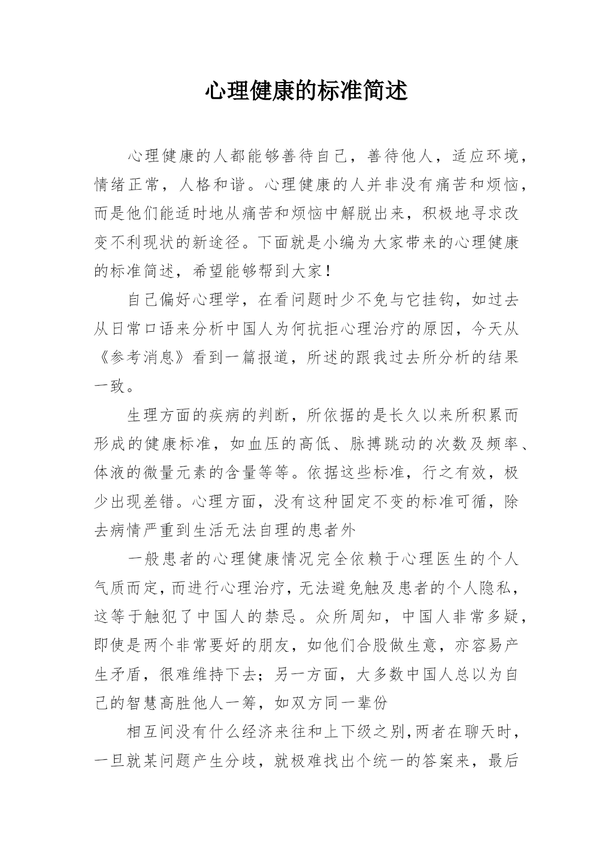 心理健康的标准简述心理健康的人都能够善待自己,善待他人,适应环境,情绪正常,人格和谐。心理健康的人并非没有痛苦和烦恼,而是他们能适时地从痛苦和烦恼中解脱出来,积极地寻求改变不利现状的新途径。下面就是小编为大家带来的心理健康的标准简述,希望能够帮到大家!自己偏好心理学,在看问题时少不免与它挂钩,如过去从日常口语来分析中国人为何抗拒心理治疗的原因,今天从《参考消息》看到一篇报道,所述的跟我过去所分析的结果一致。生理方面的疾病的判断,所依据的是长久以来所积累而形成的健康标准,如血压的高低、脉搏跳动的次数及频率、