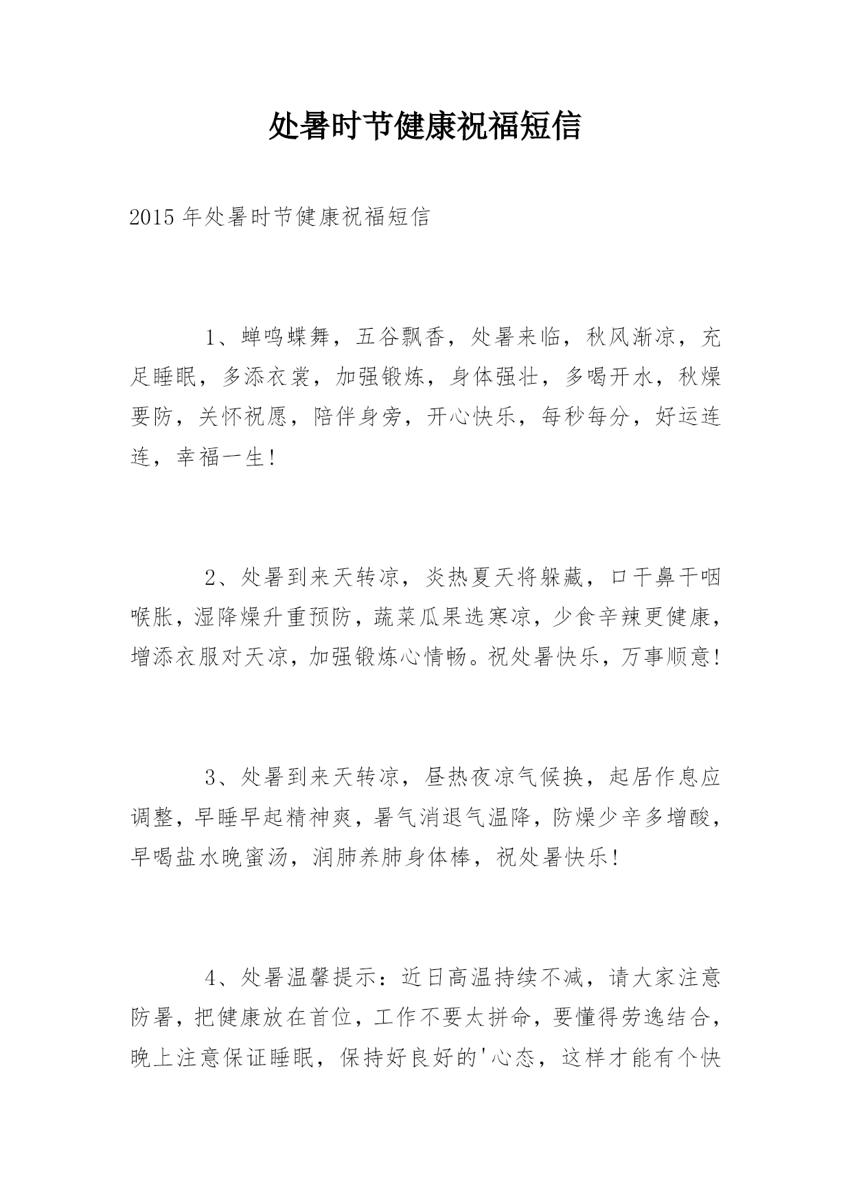 处暑时节健康祝福短信2015年处暑时节健康祝福短信1、蝉鸣蝶舞,五谷飘香,处暑来临,秋风渐凉,充足睡眠,多添衣裳,加强锻炼,身体强壮,多喝开水,秋燥要防,关怀祝愿,陪伴身旁,开心快乐,每秒每分,好运连连,幸福一生!2、处暑到来天转凉,炎热夏天将躲藏,口干鼻干咽喉胀,湿降燥升重预防,蔬菜瓜果选寒凉,少食辛辣更健康,增添衣服对天凉,加强锻炼心情畅。祝处暑快乐,万事顺意!3、处暑到来天转凉,昼热夜凉气候换,起居作息应调整,早睡早起精神爽,暑气消退气温降,防燥少辛多增酸,早喝盐水晚蜜汤,润肺养肺身体棒,祝处暑快乐