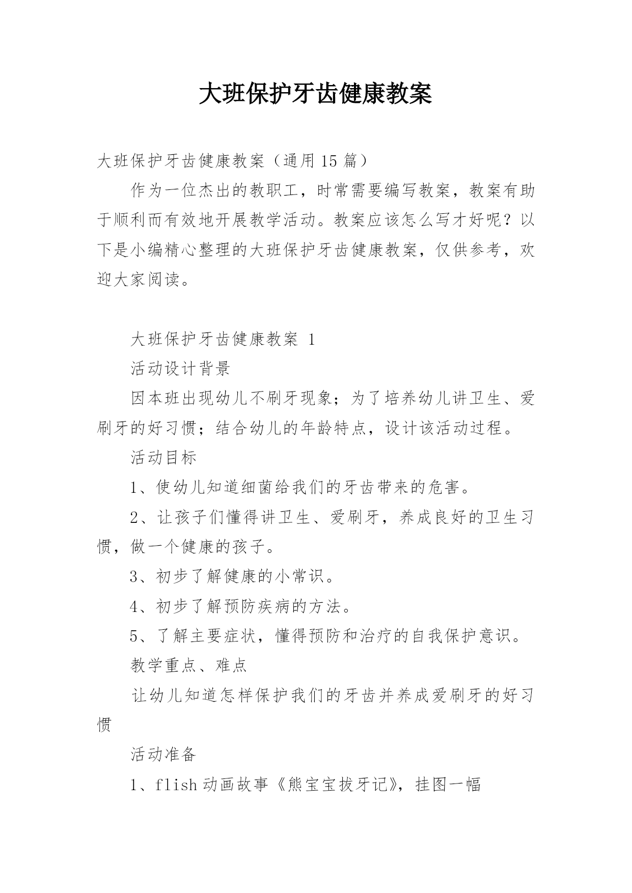 大班保护牙齿健康教案大班保护牙齿健康教案(通用15篇)作为一位杰出的教职工,时常需要编写教案,教案有助于顺利而有效地开展教学活动。教案应该怎么写才好呢?以下是小编精心整理的大班保护牙齿健康教案,仅供参考,欢迎大家阅读。大班保护牙齿健康教案1活动设计背景因本班出现幼儿不刷牙现象;为了培养幼儿讲卫生、爱刷牙的好习惯;结合幼儿的年龄特点,设计该活动过程。活动目标1、使幼儿知道细菌给我们的牙齿带来的危害。2、让孩子们懂得讲卫生、爱刷牙,养成良好的卫生习惯,做一个健康的孩子。3、初步了解健康的小常识。4、初步了解预