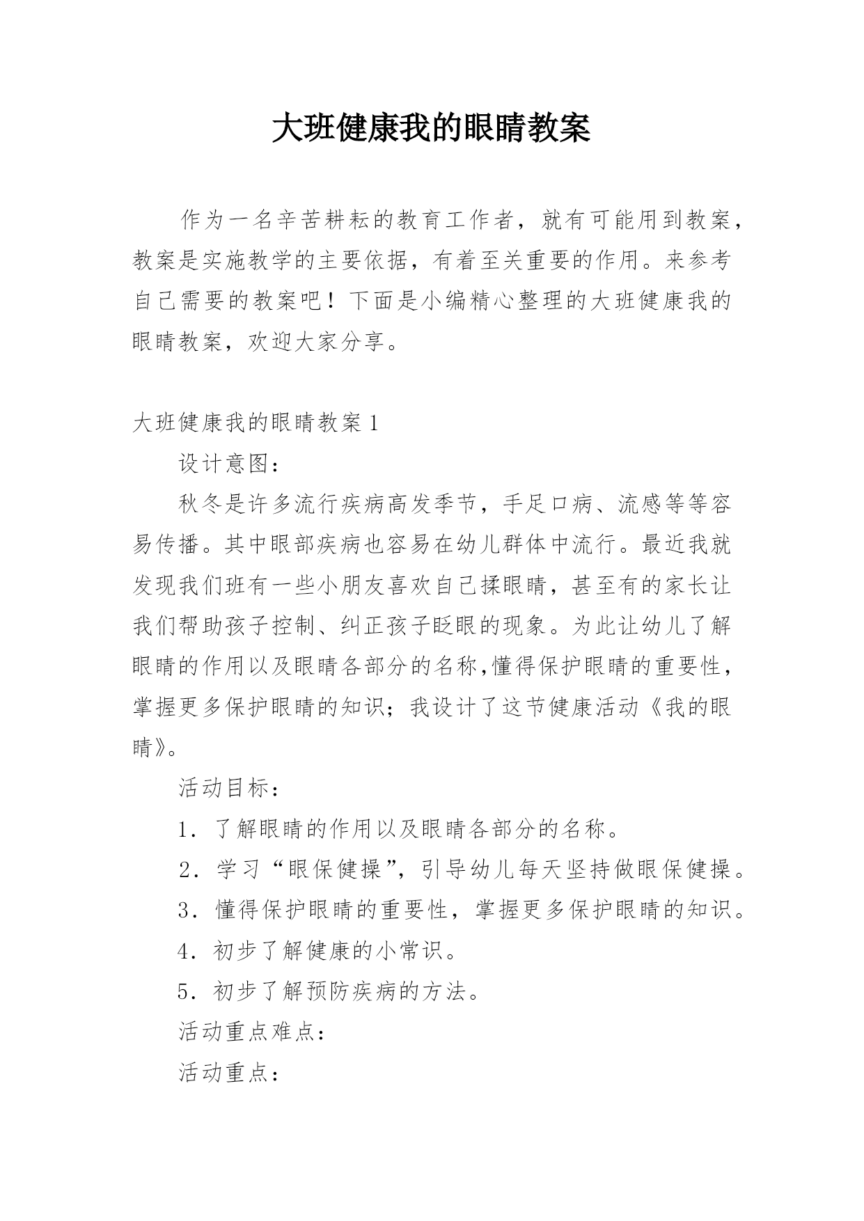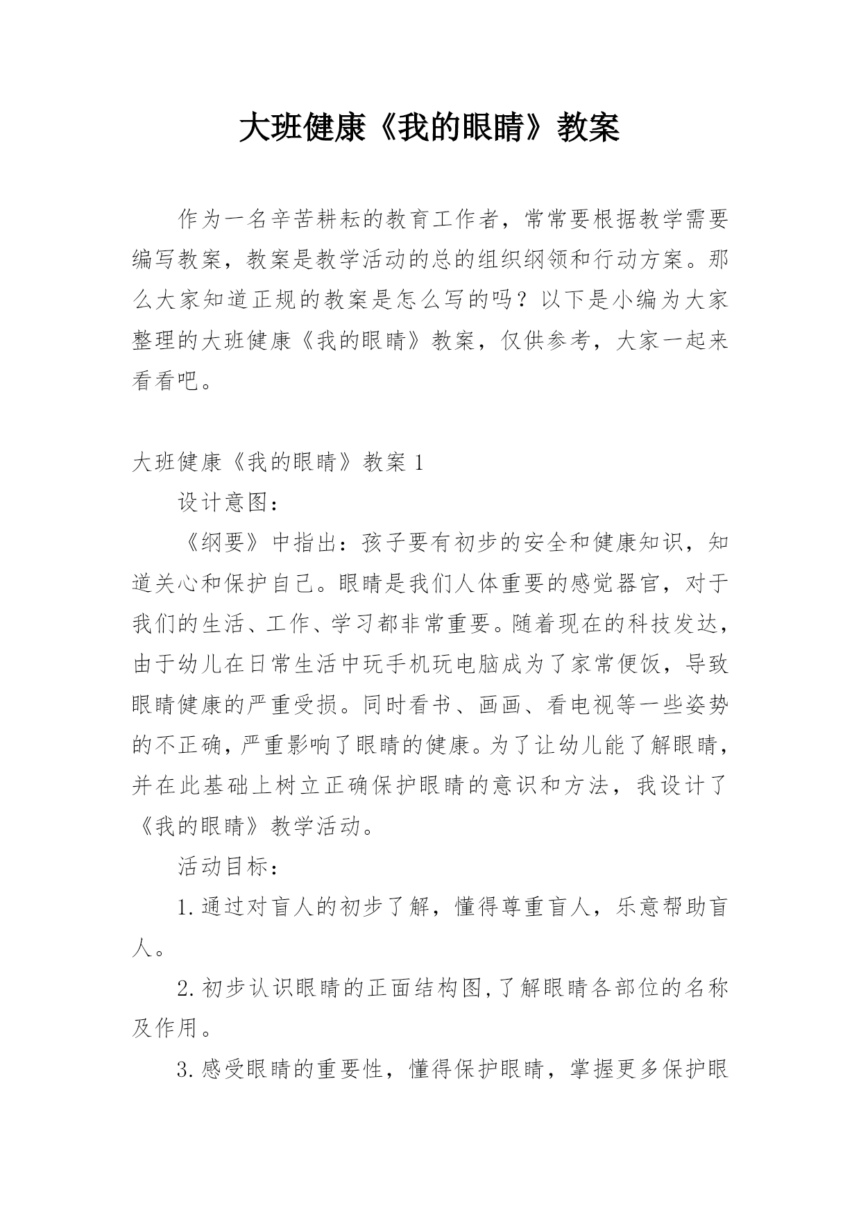 大班健康《我的眼睛》教案作为一名辛苦耕耘的教育工作者,常常要根据教学需要编写教案,教案是教学活动的总的组织纲领和行动方案。那么大家知道正规的教案是怎么写的吗?以下是小编为大家整理的大班健康《我的眼睛》教案,仅供参考,大家一起来看看吧。大班健康《我的眼睛》教案1设计意图:《纲要》中指出:孩子要有初步的安全和健康知识,知道关心和保护自己。眼睛是我们人体重要的感觉器官,对于我们的生活、工作、学习都非常重要。随着现在的科技发达,由于幼儿在日常生活中玩手机玩电脑成为了家常便饭,导致眼睛健康的严重受损。同时看书、画画
