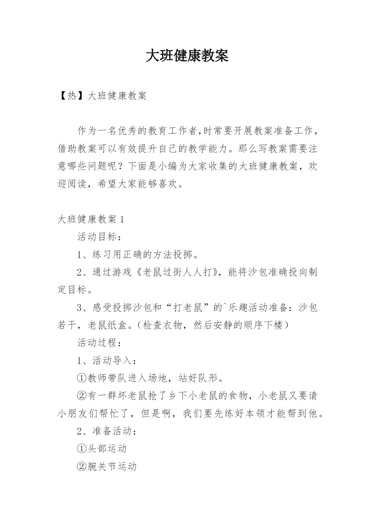 大班健康教案【热】大班健康教案作为一名优秀的教育工作者,时常要开展教案准备工作,借助教案可以有效提升自己的教学能力。那么写教案需要注意哪些问题呢?下面是小编为大家收集的大班健康教案,欢迎阅读,希望大家能够喜欢。大班健康教案1活动目标:1、练习用正确的方法投掷。2、通过游戏《老鼠过街人人打》,能将沙包准确投向制定目标。3、感受投掷沙包和“打老鼠”的`乐趣活动准备:沙包若干,老鼠纸盒。(检查衣物,然后安静的顺序下楼)活动过程:1、活动导入:①教师带队进入场地,站好队形。②有一群坏老鼠抢了乡下小老鼠的食物,小老