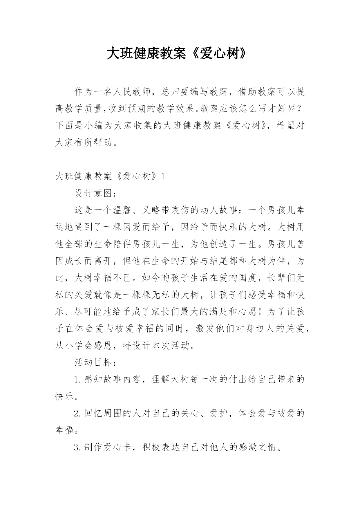 大班健康教案《爱心树》作为一名人民教师,总归要编写教案,借助教案可以提高教学质量,收到预期的教学效果。教案应该怎么写才好呢?下面是小编为大家收集的大班健康教案《爱心树》,希望对大家有所帮助。大班健康教案《爱心树》1设计意图:这是一个温馨、又略带哀伤的动人故事:一个男孩儿幸运地遇到了一棵因爱而给予,因给予而快乐的大树。大树用他全部的生命陪伴男孩儿一生,为他创造了一生。男孩儿曾因成长而离开,但他在生命的开始与结尾都和大树为伴,为此,大树幸福不已。如今的孩子生活在爱的国度,长辈们无私的关爱就像是一棵棵无私的大树