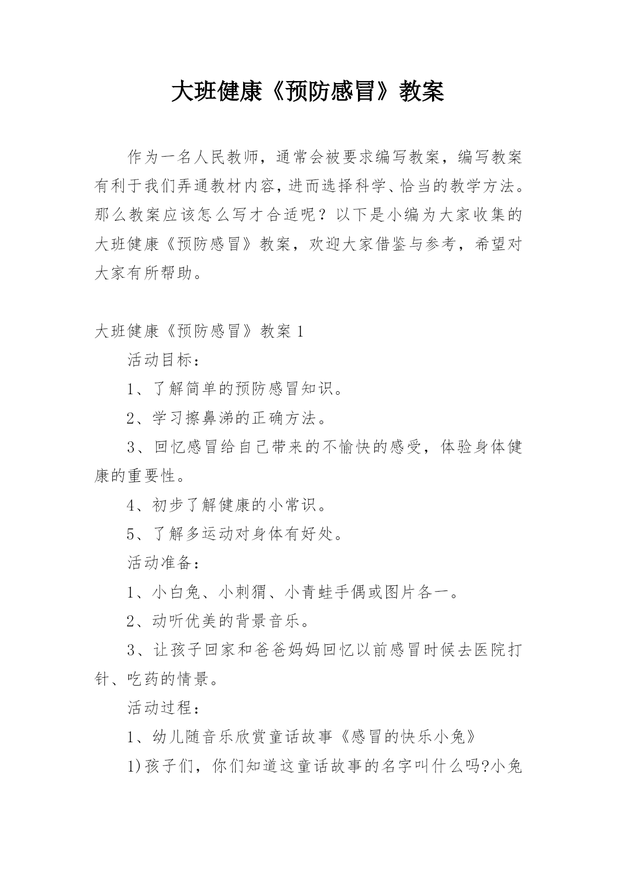 大班健康《预防感冒》教案作为一名人民教师,通常会被要求编写教案,编写教案有利于我们弄通教材内容,进而选择科学、恰当的教学方法。那么教案应该怎么写才合适呢?以下是小编为大家收集的大班健康《预防感冒》教案,欢迎大家借鉴与参考,希望对大家有所帮助。大班健康《预防感冒》教案1活动目标:1、了解简单的预防感冒知识。2、学习擦鼻涕的正确方法。3、回忆感冒给自己带来的不愉快的感受,体验身体健康的重要性。4、初步了解健康的小常识。5、了解多运动对身体有好处。活动准备:1、小白兔、小刺猬、小青蛙手偶或图片各一。2、动听优美