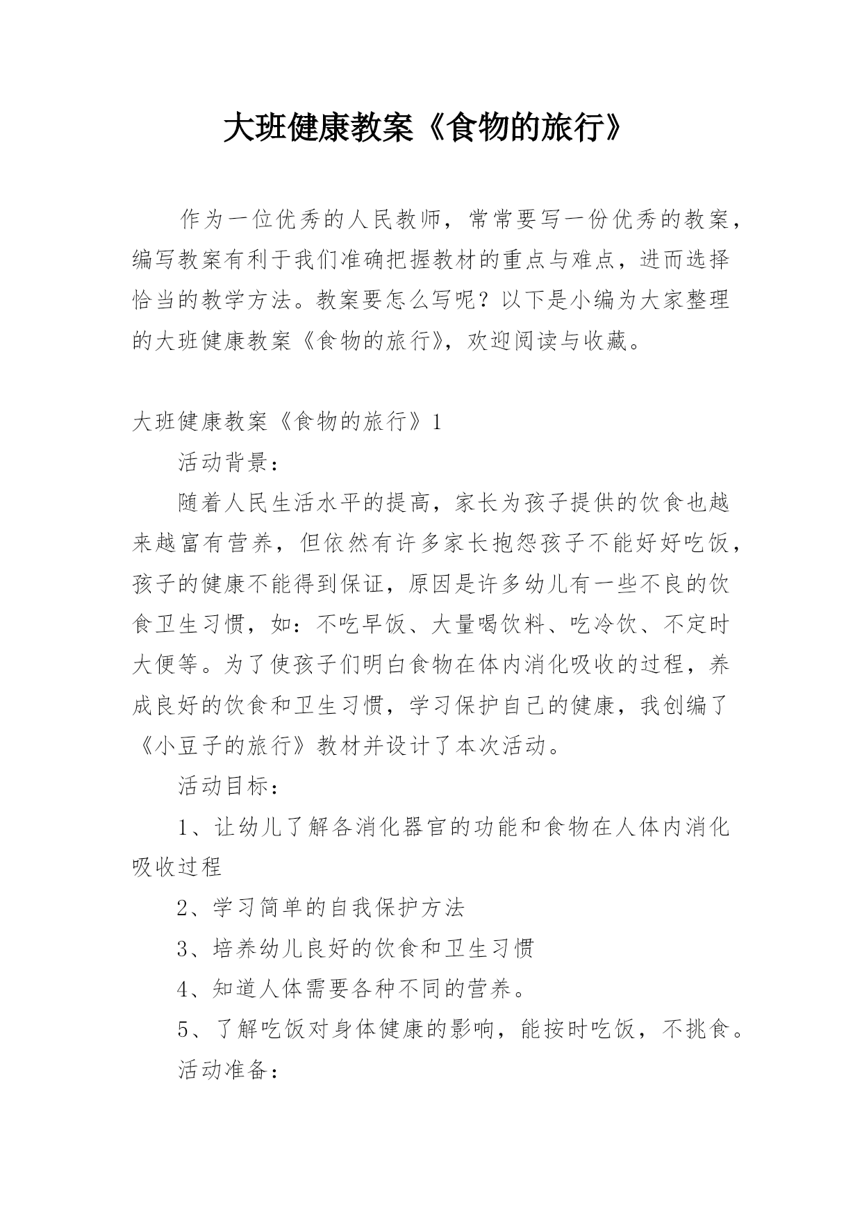 大班健康教案《食物的旅行》作为一位优秀的人民教师,常常要写一份优秀的教案,编写教案有利于我们准确把握教材的重点与难点,进而选择恰当的教学方法。教案要怎么写呢?以下是小编为大家整理的大班健康教案《食物的旅行》,欢迎阅读与收藏。大班健康教案《食物的旅行》1活动背景:随着人民生活水平的提高,家长为孩子提供的饮食也越来越富有营养,但依然有许多家长抱怨孩子不能好好吃饭,孩子的健康不能得到保证,原因是许多幼儿有一些不良的饮食卫生习惯,如:不吃早饭、大量喝饮料、吃冷饮、不定时大便等。为了使孩子们明白食物在体内消化吸收的