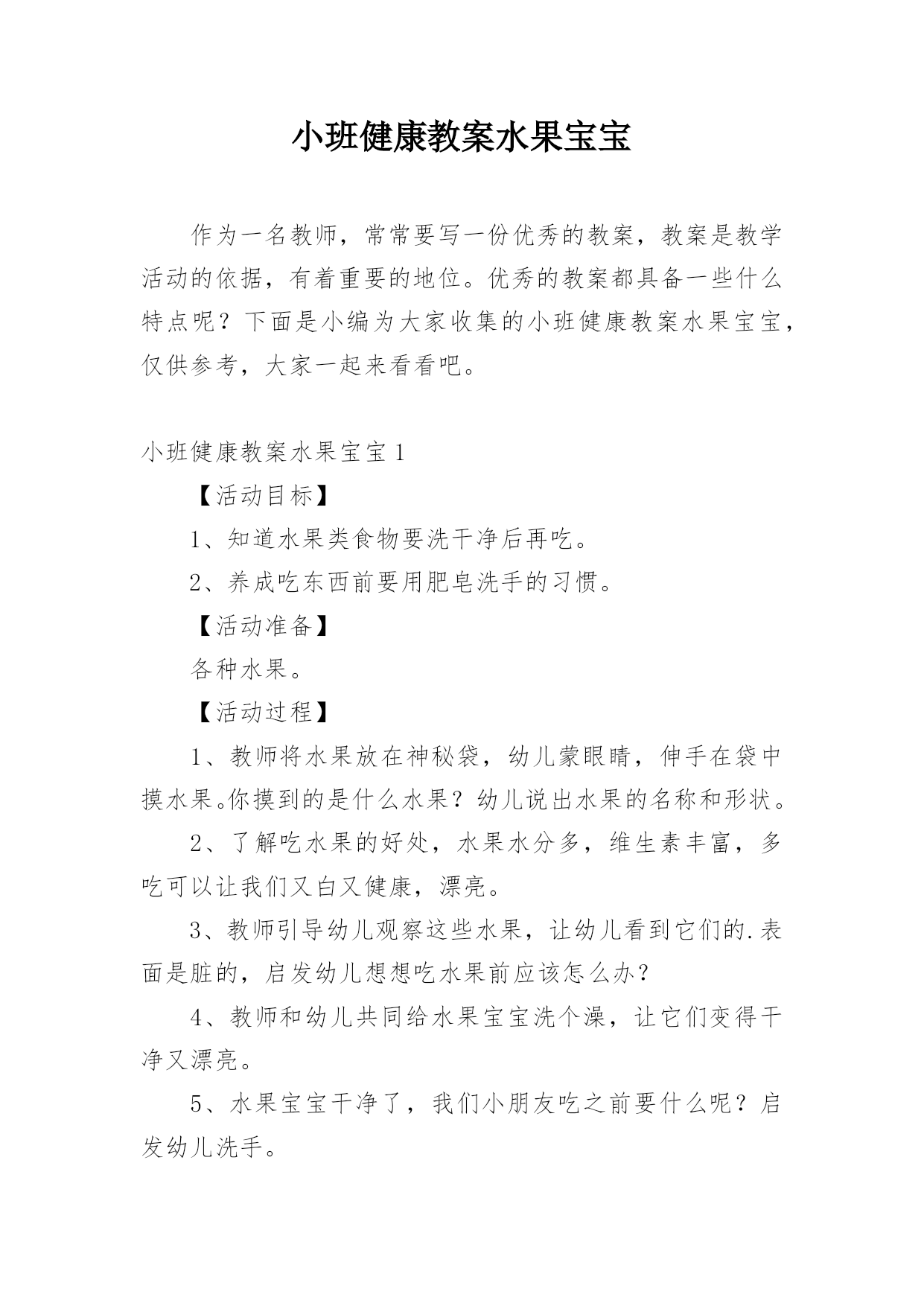 小班健康教案水果宝宝作为一名教师,常常要写一份优秀的教案,教案是教学活动的依据,有着重要的地位。优秀的教案都具备一些什么特点呢?下面是小编为大家收集的小班健康教案水果宝宝,仅供参考,大家一起来看看吧。小班健康教案水果宝宝1【活动目标】1、知道水果类食物要洗干净后再吃。2、养成吃东西前要用肥皂洗手的习惯。【活动准备】各种水果。【活动过程】1、教师将水果放在神秘袋,幼儿蒙眼睛,伸手在袋中摸水果。你摸到的是什么水果?幼儿说出水果的名称和形状。2、了解吃水果的好处,水果水分多,维生素丰富,多吃可以让我们又白又健康