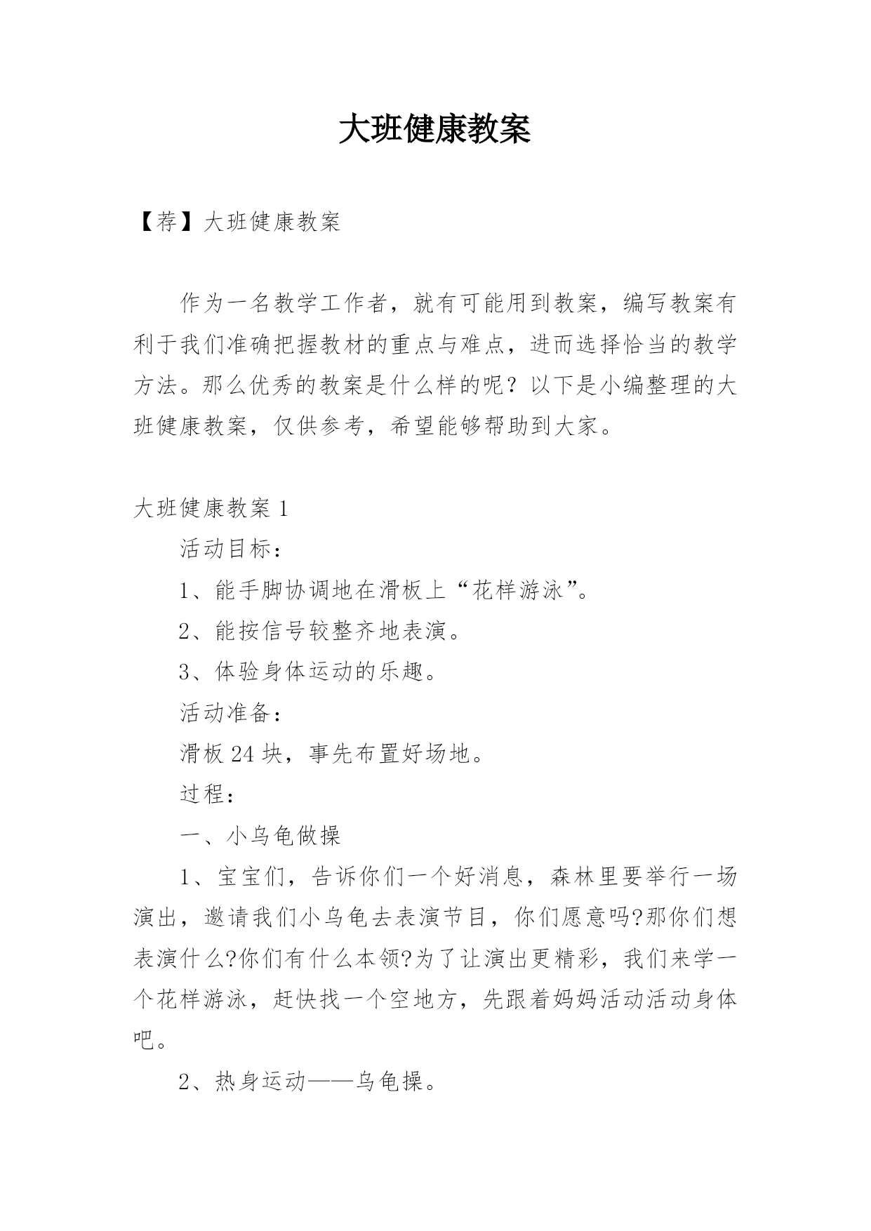大班健康教案【荐】大班健康教案作为一名教学工作者,就有可能用到教案,编写教案有利于我们准确把握教材的重点与难点,进而选择恰当的教学方法。那么优秀的教案是什么样的呢?以下是小编整理的大班健康教案,仅供参考,希望能够帮助到大家。大班健康教案1活动目标:1、能手脚协调地在滑板上“花样游泳”。2、能按信号较整齐地表演。3、体验身体运动的乐趣。活动准备:滑板24块,事先布置好场地。过程:一、小乌龟做操1、宝宝们,告诉你们一个好消息,森林里要举行一场演出,邀请我们小乌龟去表演节目,你们愿意吗?那你们想表演什么?你们有