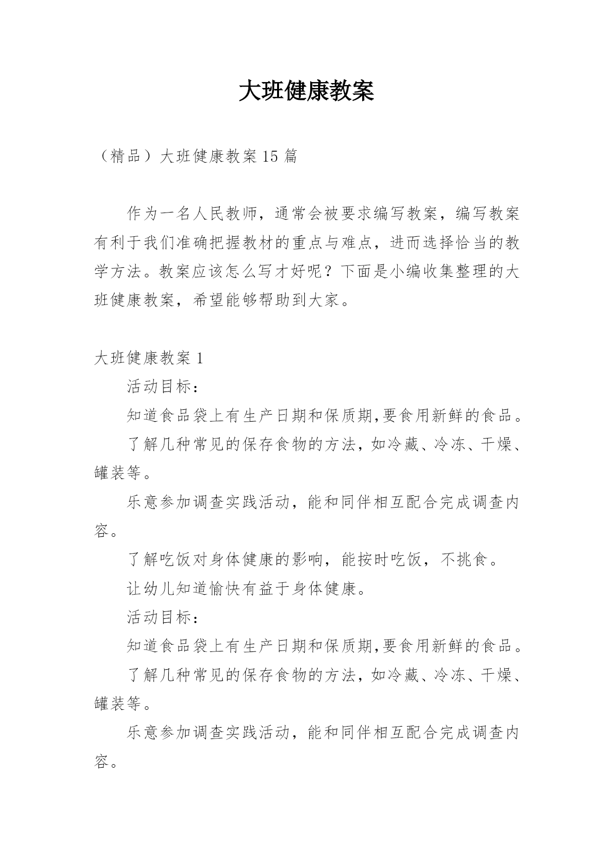 大班健康教案(精品)大班健康教案15篇作为一名人民教师,通常会被要求编写教案,编写教案有利于我们准确把握教材的重点与难点,进而选择恰当的教学方法。教案应该怎么写才好呢?下面是小编收集整理的大班健康教案,希望能够帮助到大家。大班健康教案1活动目标:知道食品袋上有生产日期和保质期,要食用新鲜的食品。了解几种常见的保存食物的方法,如冷藏、冷冻、干燥、罐装等。乐意参加调查实践活动,能和同伴相互配合完成调查内容。了解吃饭对身体健康的影响,能按时吃饭,不挑食。让幼儿知道愉快有益于身体健康。活动目标:知道食品袋上有生产
