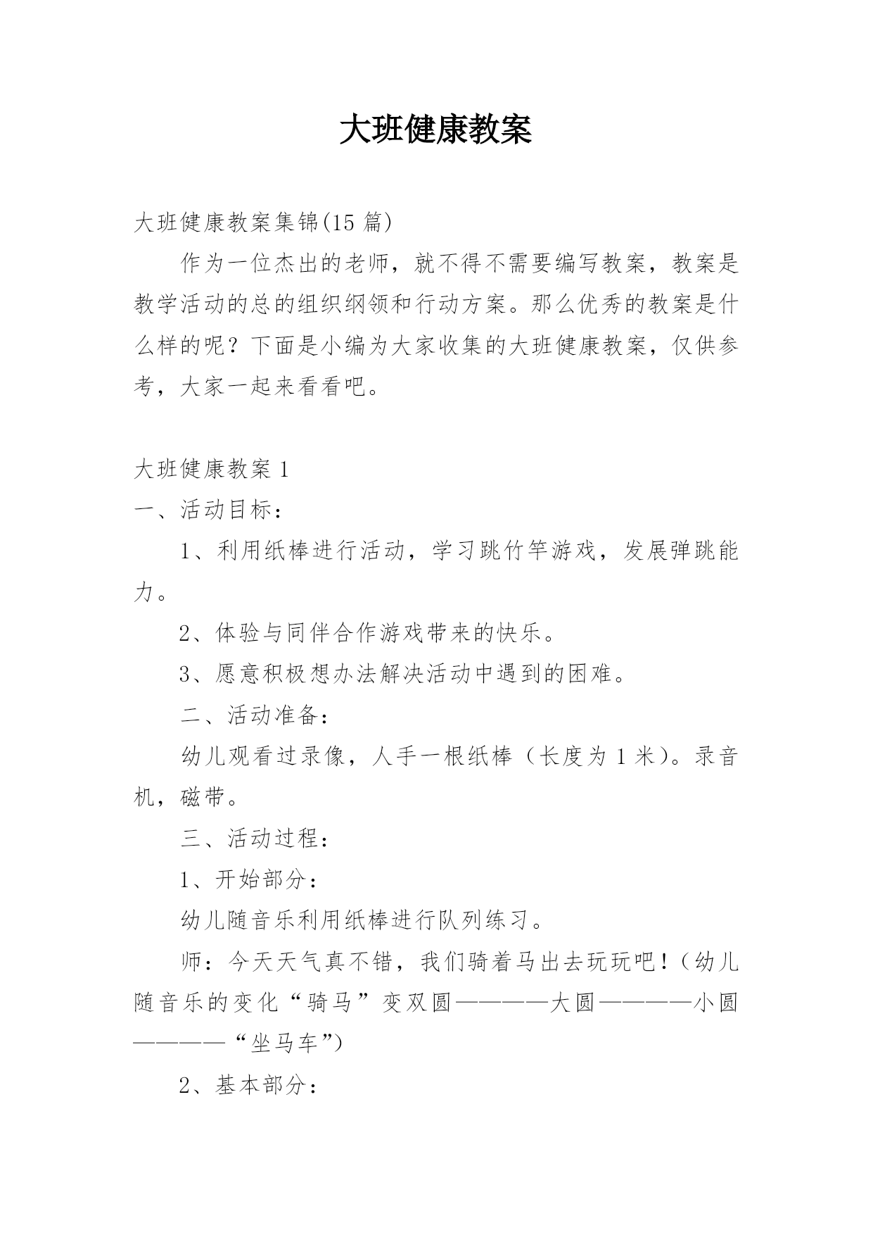 大班健康教案大班健康教案集锦(15篇)作为一位杰出的老师,就不得不需要编写教案,教案是教学活动的总的组织纲领和行动方案。那么优秀的教案是什么样的呢?下面是小编为大家收集的大班健康教案,仅供参考,大家一起来看看吧。大班健康教案1一、活动目标:1、利用纸棒进行活动,学习跳竹竿游戏,发展弹跳能力。2、体验与同伴合作游戏带来的快乐。3、愿意积极想办法解决活动中遇到的困难。二、活动准备:幼儿观看过录像,人手一根纸棒(长度为1米)。录音机,磁带。三、活动过程:1、开始部分:幼儿随音乐利用纸棒进行队列练习。师:今天天气