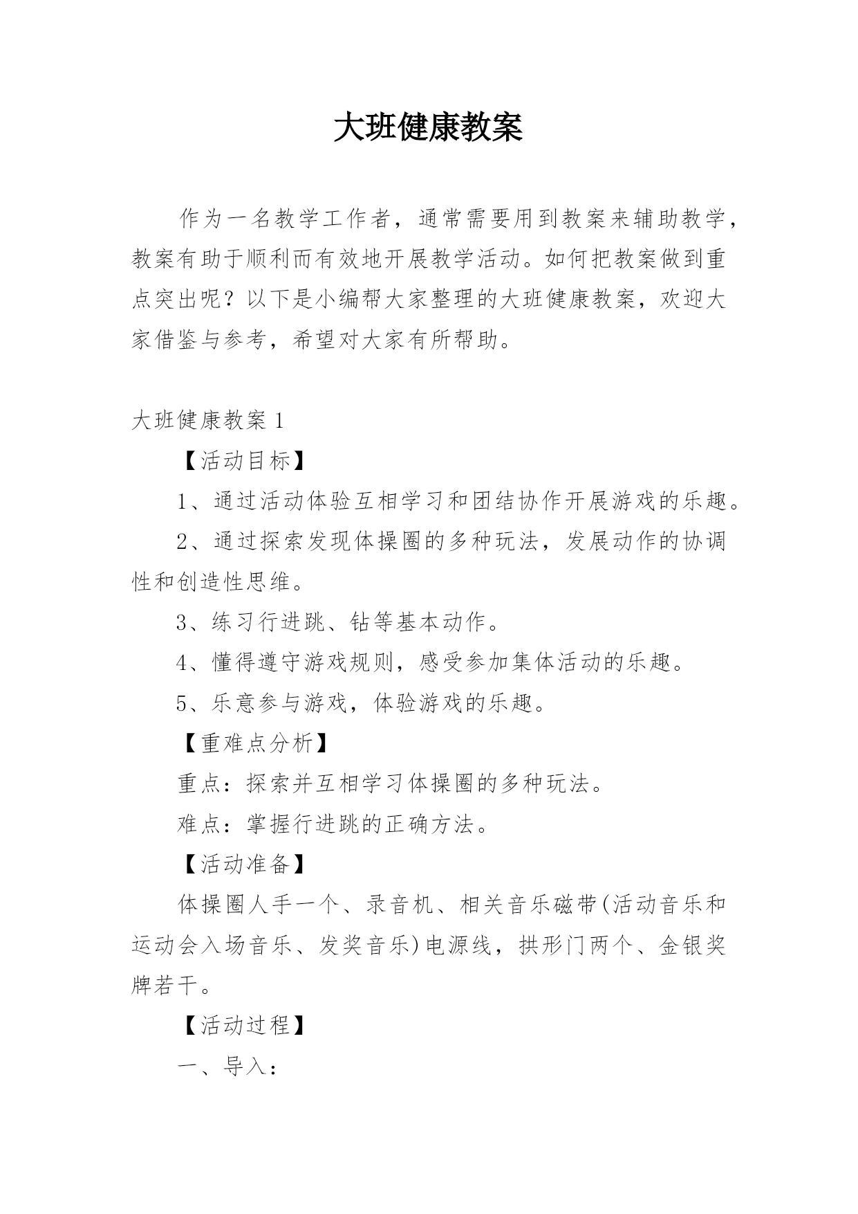 大班健康教案作为一名教学工作者,通常需要用到教案来辅助教学,教案有助于顺利而有效地开展教学活动。如何把教案做到重点突出呢?以下是小编帮大家整理的大班健康教案,欢迎大家借鉴与参考,希望对大家有所帮助。大班健康教案1【活动目标】1、通过活动体验互相学习和团结协作开展游戏的乐趣。2、通过探索发现体操圈的多种玩法,发展动作的协调性和创造性思维。3、练习行进跳、钻等基本动作。4、懂得遵守游戏规则,感受参加集体活动的乐趣。5、乐意参与游戏,体验游戏的乐趣。【重难点分析】重点:探索并互相学习体操圈的多种玩法。难点:掌握