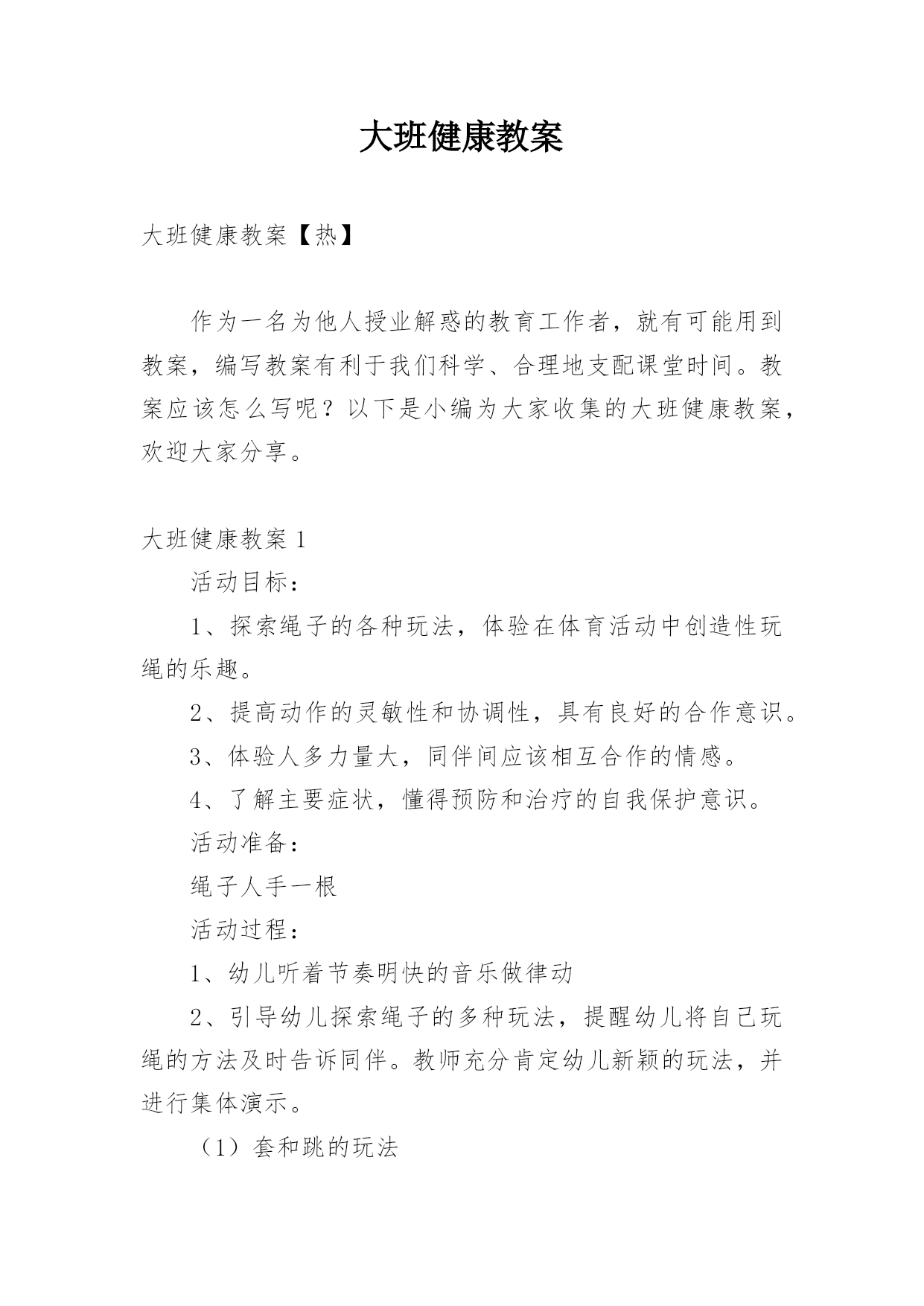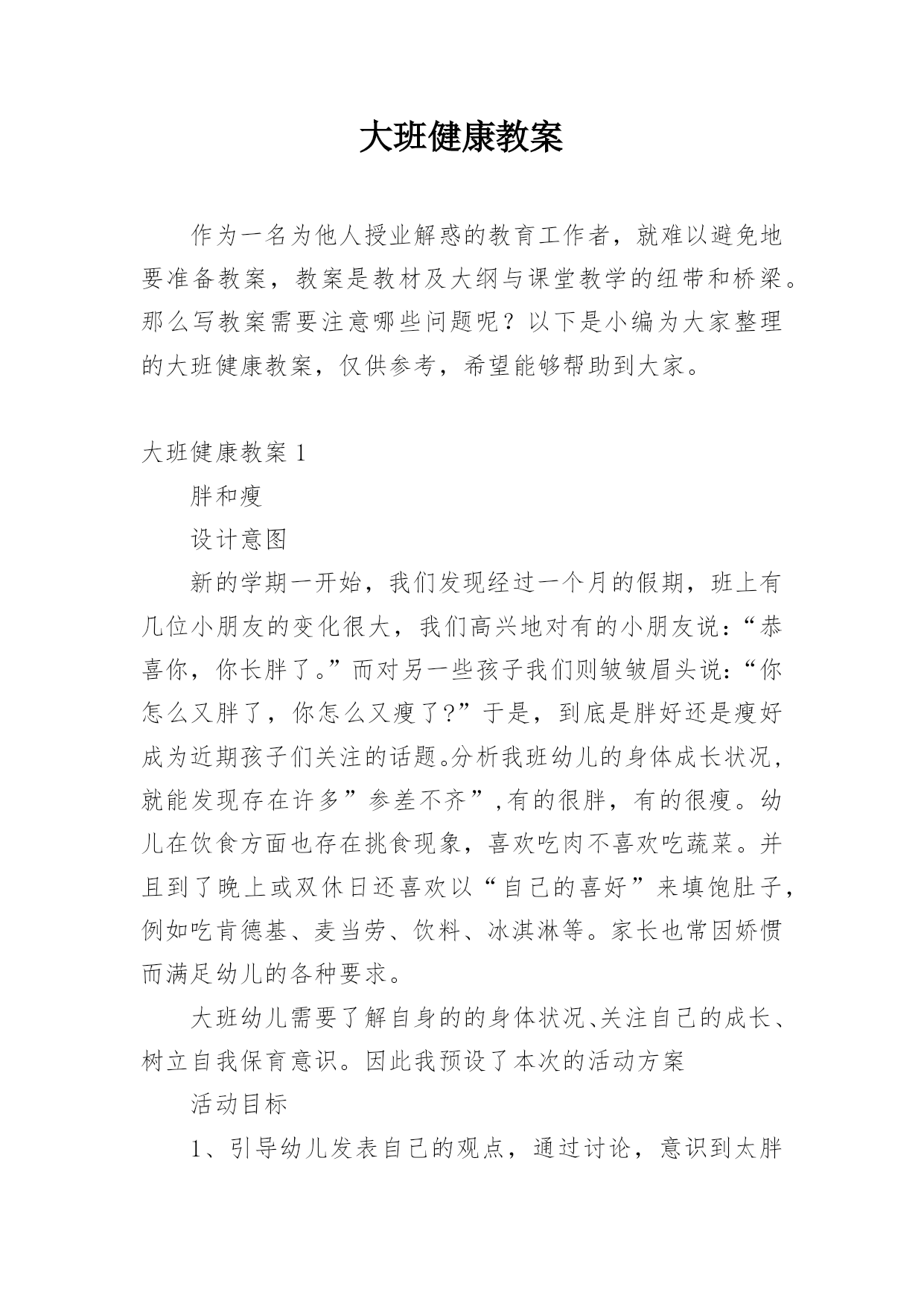 大班健康教案作为一名为他人授业解惑的教育工作者,就难以避免地要准备教案,教案是教材及大纲与课堂教学的纽带和桥梁。那么写教案需要注意哪些问题呢?以下是小编为大家整理的大班健康教案,仅供参考,希望能够帮助到大家。大班健康教案1胖和瘦设计意图新的学期一开始,我们发现经过一个月的假期,班上有几位小朋友的变化很大,我们高兴地对有的小朋友说:“恭喜你,你长胖了。”而对另一些孩子我们则皱皱眉头说:“你怎么又胖了,你怎么又瘦了?”于是,到底是胖好还是瘦好成为近期孩子们关注的话题。分析我班幼儿的身体成长状况,就能发现存在许