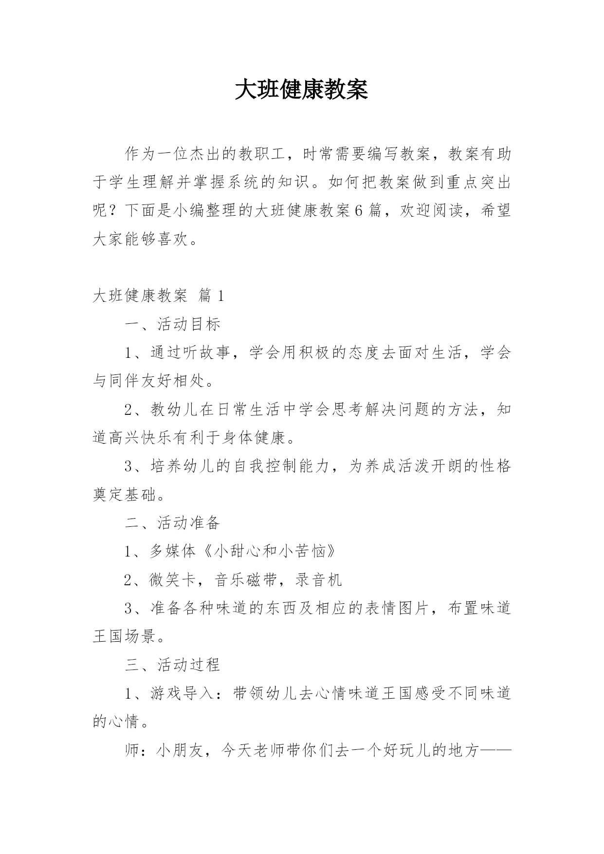大班健康教案作为一位杰出的教职工,时常需要编写教案,教案有助于学生理解并掌握系统的知识。如何把教案做到重点突出呢?下面是小编整理的大班健康教案6篇,欢迎阅读,希望大家能够喜欢。大班健康教案篇1一、活动目标1、通过听故事,学会用积极的态度去面对生活,学会与同伴友好相处。2、教幼儿在日常生活中学会思考解决问题的方法,知道高兴快乐有利于身体健康。3、培养幼儿的自我控制能力,为养成活泼开朗的性格奠定基础。二、活动准备1、多媒体《小甜心和小苦恼》2、微笑卡,音乐磁带,录音机3、准备各种味道的东西及相应的表情图片,布