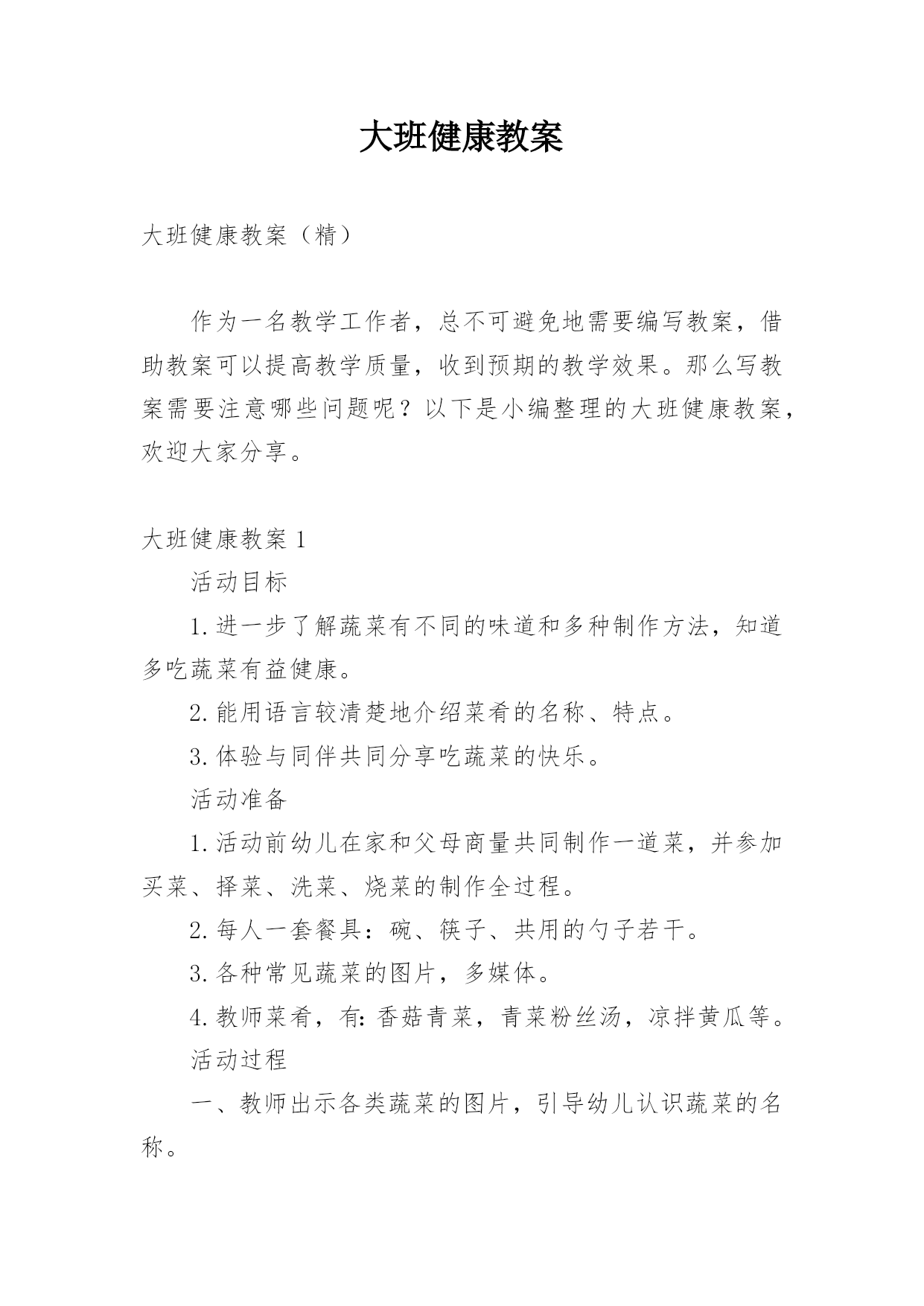 大班健康教案大班健康教案(精)作为一名教学工作者,总不可避免地需要编写教案,借助教案可以提高教学质量,收到预期的教学效果。那么写教案需要注意哪些问题呢?以下是小编整理的大班健康教案,欢迎大家分享。大班健康教案1活动目标1.进一步了解蔬菜有不同的味道和多种制作方法,知道多吃蔬菜有益健康。2.能用语言较清楚地介绍菜肴的名称、特点。3.体验与同伴共同分享吃蔬菜的快乐。活动准备1.活动前幼儿在家和父母商量共同制作一道菜,并参加买菜、择菜、洗菜、烧菜的制作全过程。2.每人一套餐具:碗、筷子、共用的勺子若干。3.各种