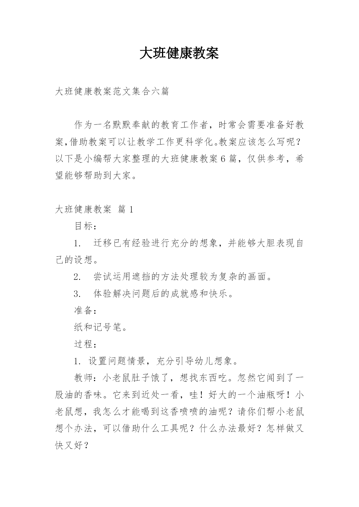大班健康教案大班健康教案范文集合六篇作为一名默默奉献的教育工作者,时常会需要准备好教案,借助教案可以让教学工作更科学化。教案应该怎么写呢?以下是小编帮大家整理的大班健康教案6篇,仅供参考,希望能够帮助到大家。大班健康教案篇1目标:1.迁移已有经验进行充分的想象,并能够大胆表现自己的设想。2.尝试运用遮挡的方法处理较为复杂的画面。3.体验解决问题后的成就感和快乐。准备:纸和记号笔。过程:1.设置问题情景,充分引导幼儿想象。教师:小老鼠肚子饿了,想找东西吃。忽然它闻到了一股油的香味。它来到近处一看,哇!好大的