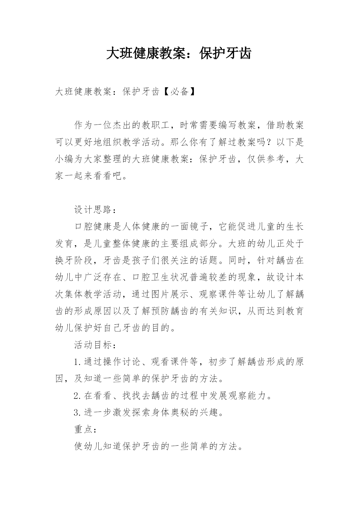 大班健康教案:保护牙齿大班健康教案:保护牙齿【必备】作为一位杰出的教职工,时常需要编写教案,借助教案可以更好地组织教学活动。那么你有了解过教案吗?以下是小编为大家整理的大班健康教案:保护牙齿,仅供参考,大家一起来看看吧。设计思路:口腔健康是人体健康的一面镜子,它能促进儿童的生长发育,是儿童整体健康的主要组成部分。大班的幼儿正处于换牙阶段,牙齿是孩子们很关注的话题。同时,针对龋齿在幼儿中广泛存在、口腔卫生状况普遍较差的现象,故设计本次集体教学活动,通过图片展示、观察课件等让幼儿了解龋齿的形成原因以及了解预防