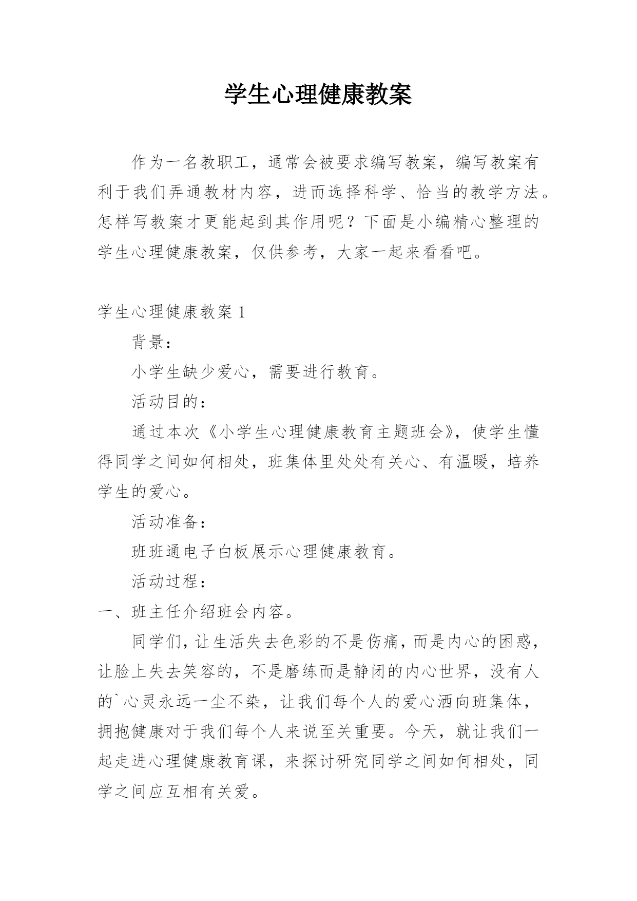 学生心理健康教案作为一名教职工,通常会被要求编写教案,编写教案有利于我们弄通教材内容,进而选择科学、恰当的教学方法。怎样写教案才更能起到其作用呢?下面是小编精心整理的学生心理健康教案,仅供参考,大家一起来看看吧。学生心理健康教案1背景:小学生缺少爱心,需要进行教育。活动目的:通过本次《小学生心理健康教育主题班会》,使学生懂得同学之间如何相处,班集体里处处有关心、有温暖,培养学生的爱心。活动准备:班班通电子白板展示心理健康教育。活动过程:一、班主任介绍班会内容。同学们,让生活失去色彩的不是伤痛,而是内心的困