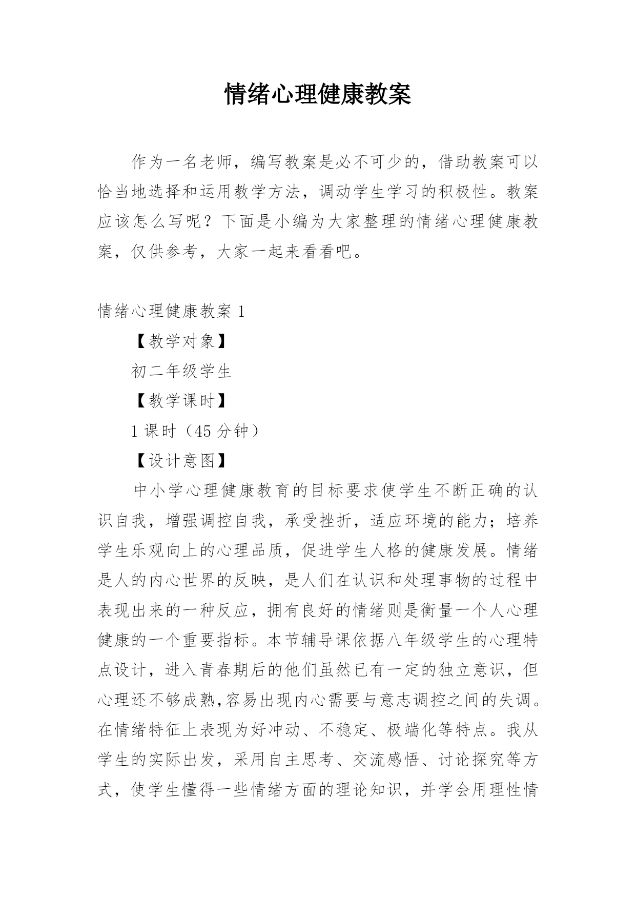 情绪心理健康教案作为一名老师,编写教案是必不可少的,借助教案可以恰当地选择和运用教学方法,调动学生学习的积极性。教案应该怎么写呢?下面是小编为大家整理的情绪心理健康教案,仅供参考,大家一起来看看吧。情绪心理健康教案1【教学对象】初二年级学生【教学课时】1课时(45分钟)【设计意图】中小学心理健康教育的目标要求使学生不断正确的认识自我,增强调控自我,承受挫折,适应环境的能力;培养学生乐观向上的心理品质,促进学生人格的健康发展。情绪是人的内心世界的反映,是人们在认识和处理事物的过程中表现出来的一种反应,拥有良