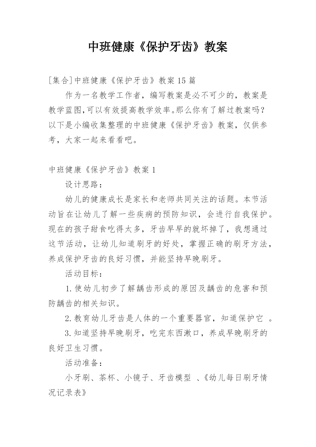 中班健康《保护牙齿》教案[集合]中班健康《保护牙齿》教案15篇作为一名教学工作者,编写教案是必不可少的,教案是教学蓝图,可以有效提高教学效率。那么你有了解过教案吗?以下是小编收集整理的中班健康《保护牙齿》教案,仅供参考,大家一起来看看吧。中班健康《保护牙齿》教案1设计思路:幼儿的健康成长是家长和老师共同关注的话题。本节活动旨在让幼儿了解一些疾病的预防知识,会进行自我保护。现在的孩子甜食吃得太多,牙齿早早的就坏掉了,我想通过这节活动,让幼儿知道刷牙的好处,掌握正确的刷牙方法,养成保护牙齿的良好习惯,并能坚持