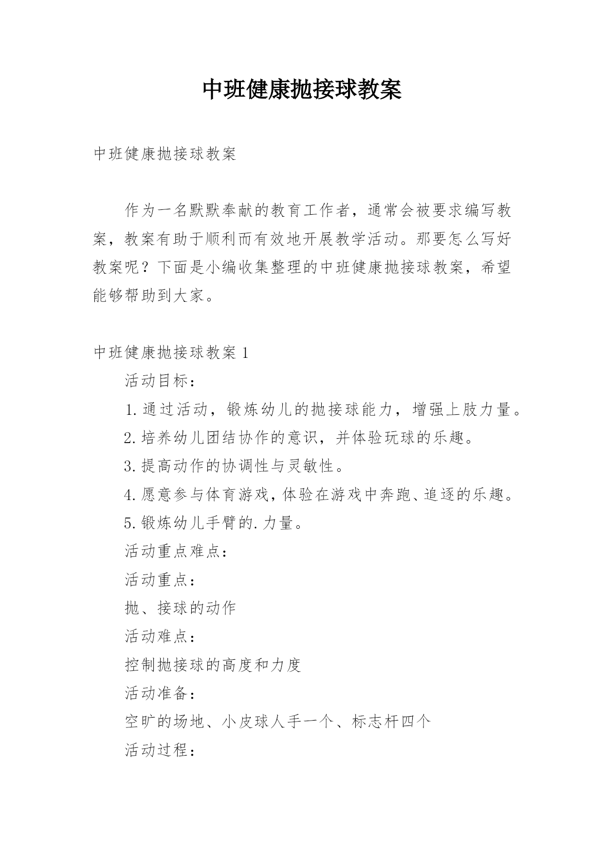 中班健康抛接球教案中班健康抛接球教案作为一名默默奉献的教育工作者,通常会被要求编写教案,教案有助于顺利而有效地开展教学活动。那要怎么写好教案呢?下面是小编收集整理的中班健康抛接球教案,希望能够帮助到大家。中班健康抛接球教案1活动目标:1.通过活动,锻炼幼儿的抛接球能力,增强上肢力量。2.培养幼儿团结协作的意识,并体验玩球的乐趣。3.提高动作的协调性与灵敏性。4.愿意参与体育游戏,体验在游戏中奔跑、追逐的乐趣。5.锻炼幼儿手臂的.力量。活动重点难点:活动重点:抛、接球的动作活动难点:控制抛接球的高度和力度活