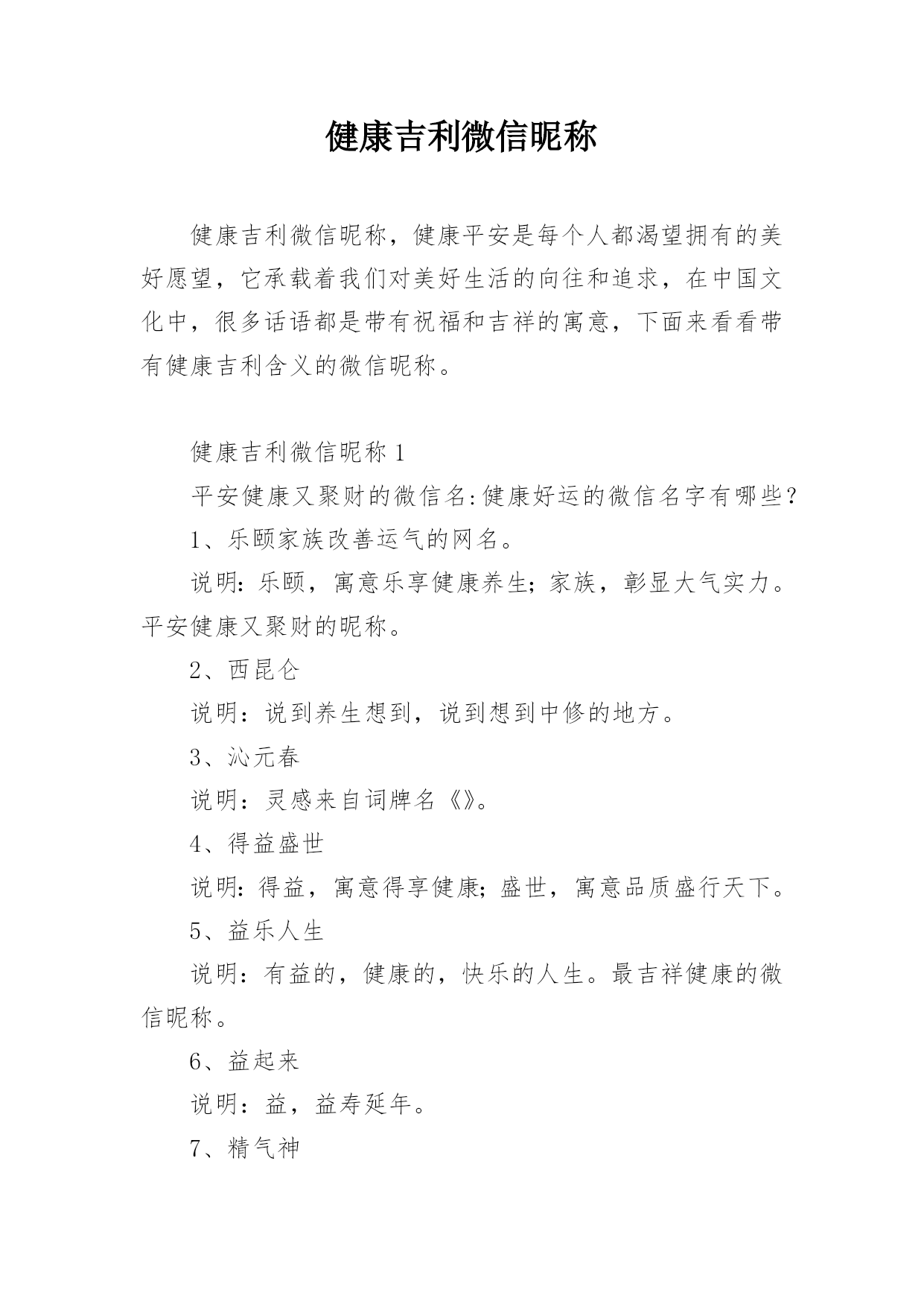 健康吉利微信昵称健康吉利微信昵称,健康平安是每个人都渴望拥有的美好愿望,它承载着我们对美好生活的向往和追求,在中国文化中,很多话语都是带有祝福和吉祥的寓意,下面来看看带有健康吉利含义的微信昵称。健康吉利微信昵称1平安健康又聚财的微信名:健康好运的微信名字有哪些?1、乐颐家族改善运气的网名。说明:乐颐,寓意乐享健康养生;家族,彰显大气实力。平安健康又聚财的昵称。2、西昆仑说明:说到养生想到,说到想到中修的地方。3、沁元春说明:灵感来自词牌名《》。4、得益盛世说明:得益,寓意得享健康;盛世,寓意品质盛行天下。