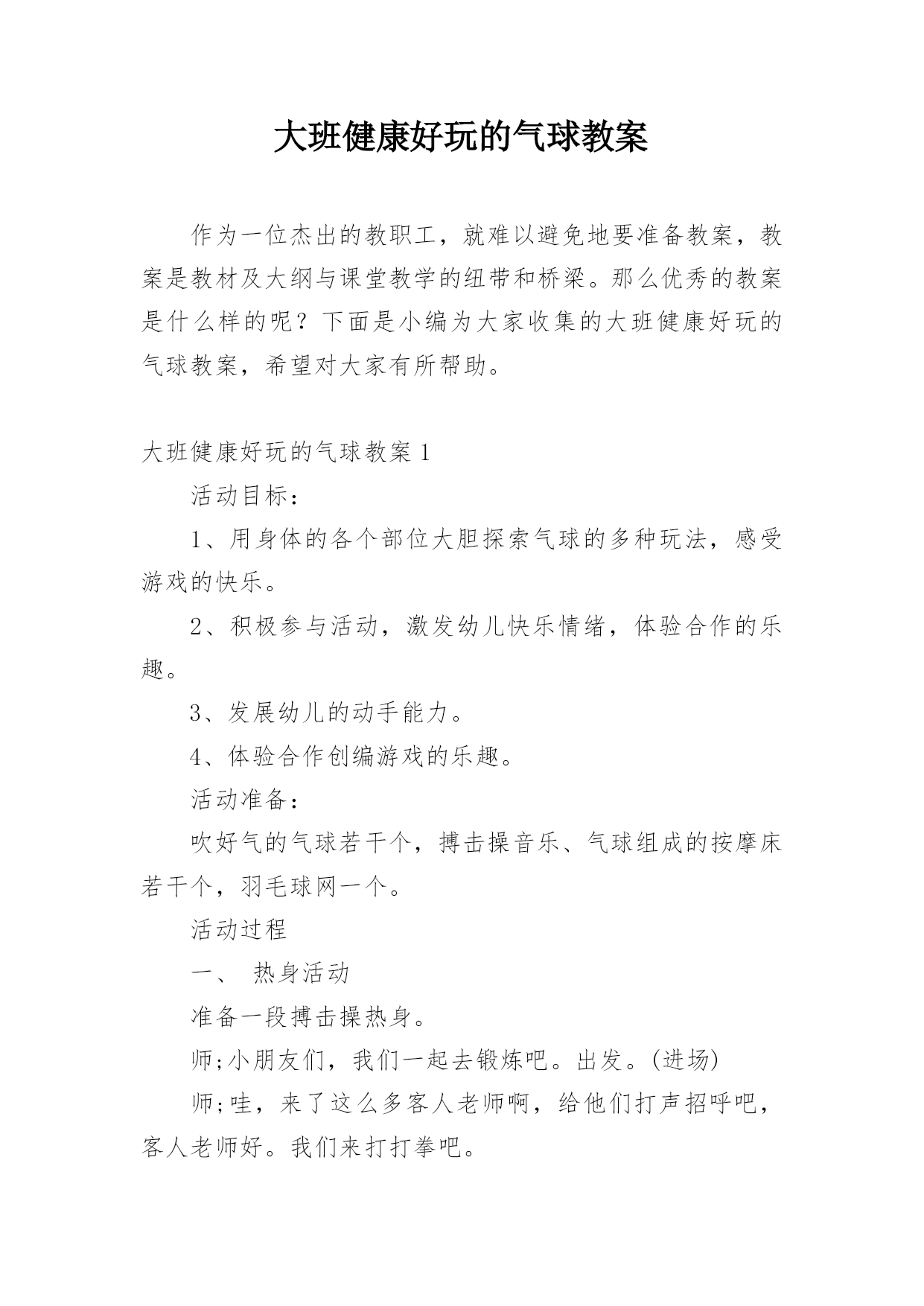 大班健康好玩的气球教案作为一位杰出的教职工,就难以避免地要准备教案,教案是教材及大纲与课堂教学的纽带和桥梁。那么优秀的教案是什么样的呢?下面是小编为大家收集的大班健康好玩的气球教案,希望对大家有所帮助。大班健康好玩的气球教案1活动目标:1、用身体的各个部位大胆探索气球的多种玩法,感受游戏的快乐。2、积极参与活动,激发幼儿快乐情绪,体验合作的乐趣。3、发展幼儿的动手能力。4、体验合作创编游戏的乐趣。活动准备:吹好气的气球若干个,搏击操音乐、气球组成的按摩床若干个,羽毛球网一个。活动过程一、热身活动准备一段搏