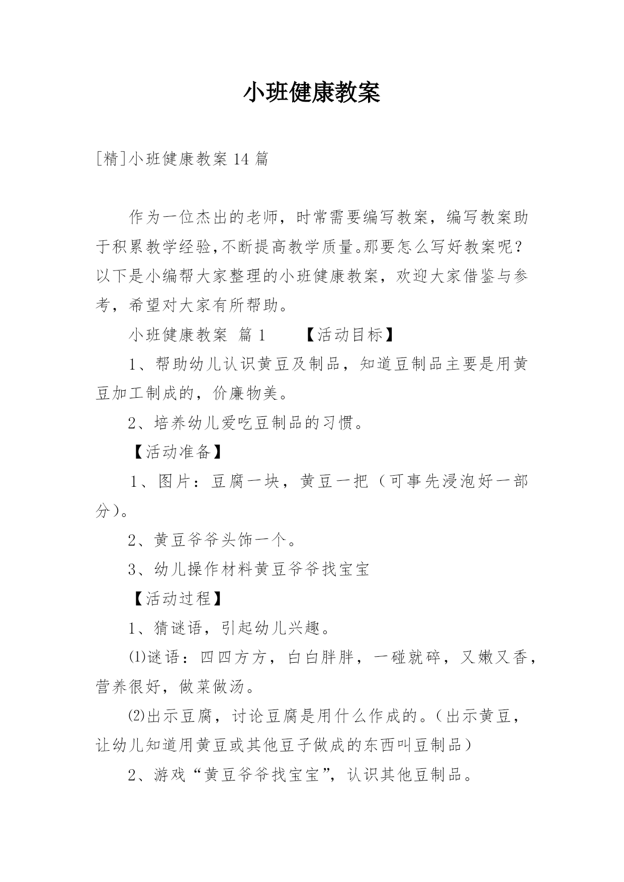 小班健康教案[精]小班健康教案14篇作为一位杰出的老师,时常需要编写教案,编写教案助于积累教学经验,不断提高教学质量。那要怎么写好教案呢?以下是小编帮大家整理的小班健康教案,欢迎大家借鉴与参考,希望对大家有所帮助。小班健康教案篇1【活动目标】1、帮助幼儿认识黄豆及制品,知道豆制品主要是用黄豆加工制成的,价廉物美。2、培养幼儿爱吃豆制品的习惯。【活动准备】1、图片:豆腐一块,黄豆一把(可事先浸泡好一部分)。2、黄豆爷爷头饰一个。3、幼儿操作材料黄豆爷爷找宝宝【活动过程】1、猜谜语,引起幼儿兴趣。⑴谜语:四四